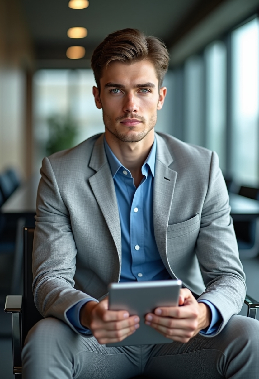 Мужчина в светло-сером костюме с узором «ёлочка» и синей рубашке сидит на фоне переговорной комнаты с большими окнами. Он смотрит прямо в камеру, держа планшет в руках. Позади видны современные офисные интерьеры. Освещение естественное, акцент на его современном и профессиональном стиле.