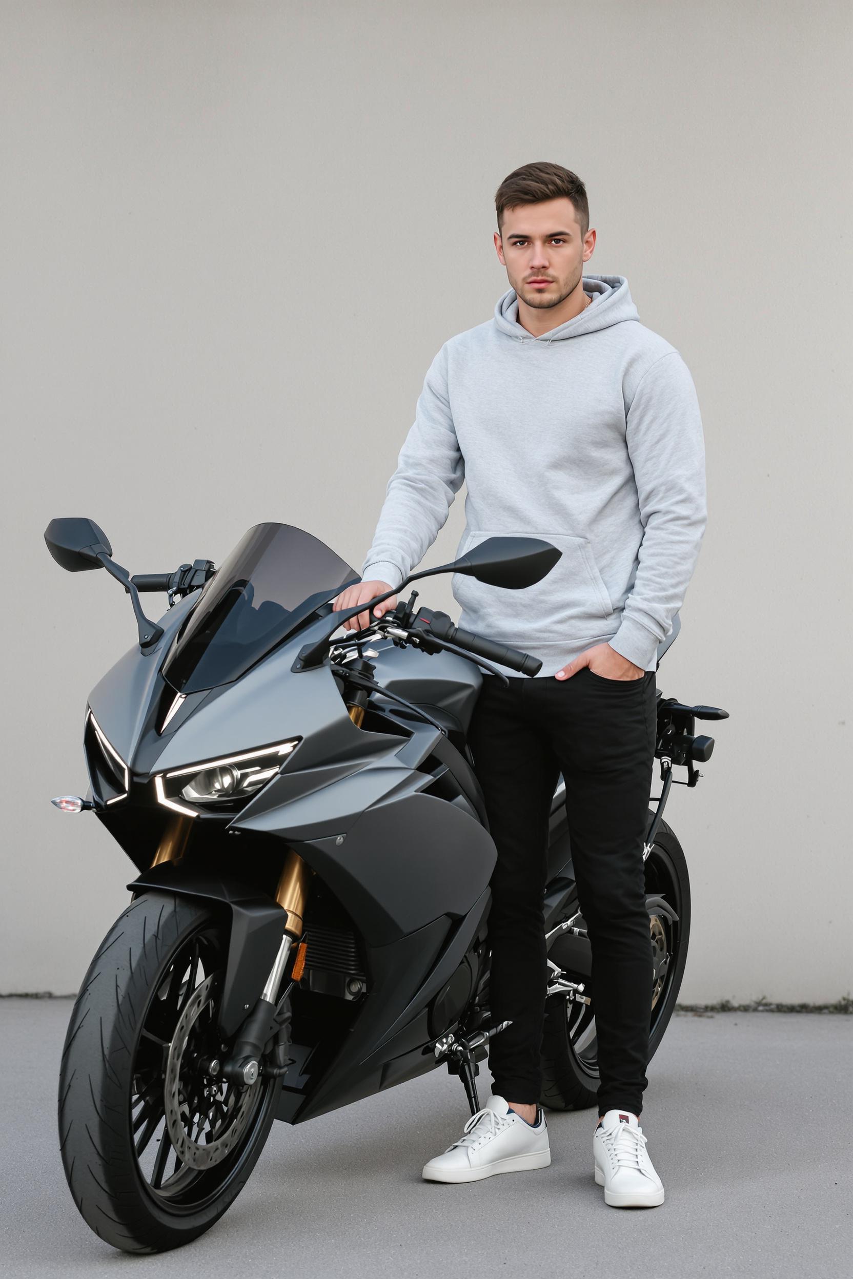 Мужчина в светло-серой толстовке без капюшона, черных брюках и белых минималистичных кроссовках стоит рядом с лаконичным современным мотоциклом. Серьёзный взгляд в камеру, средний план, нейтральный бетонный фон.