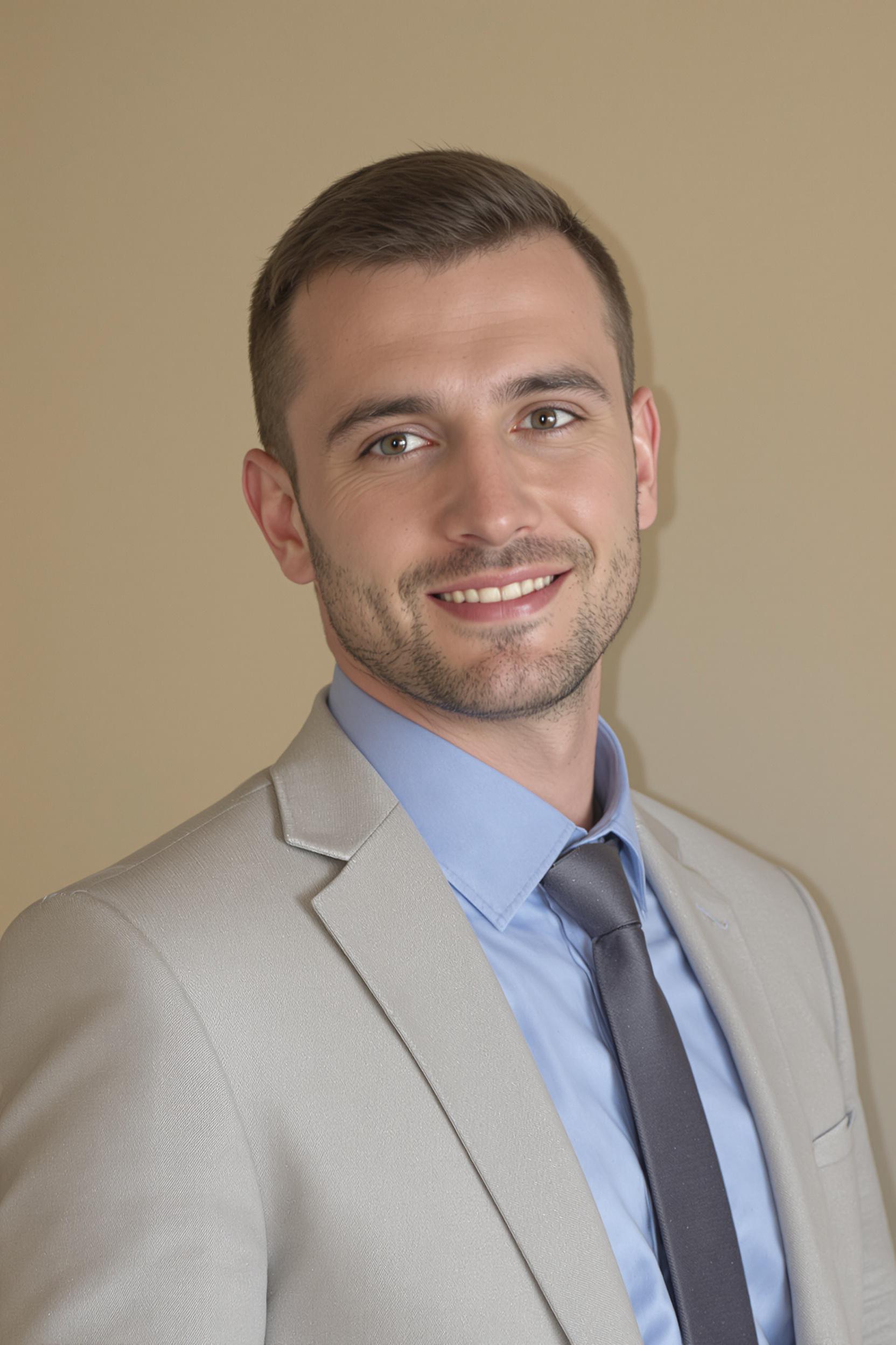 Мужчина в светлом деловом костюме и голубой рубашке, без галстука, аккуратная прическа, легкая улыбка, крупный план лица и плеч на фоне приглушённо-бежевого офисного интерьера, смотрит прямо в камеру