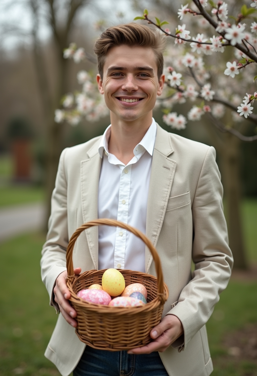 Мужчина в светлом костюме с льняной рубашкой держит в руках плетёную корзину с куличами и крашеными яйцами. Он стоит в монастырском саду, окружённом цветущими деревьями, и смотрит в камеру с доброжелательной улыбкой. Крупный план, подчёркивающий весеннюю атмосферу и чистоту праздника.