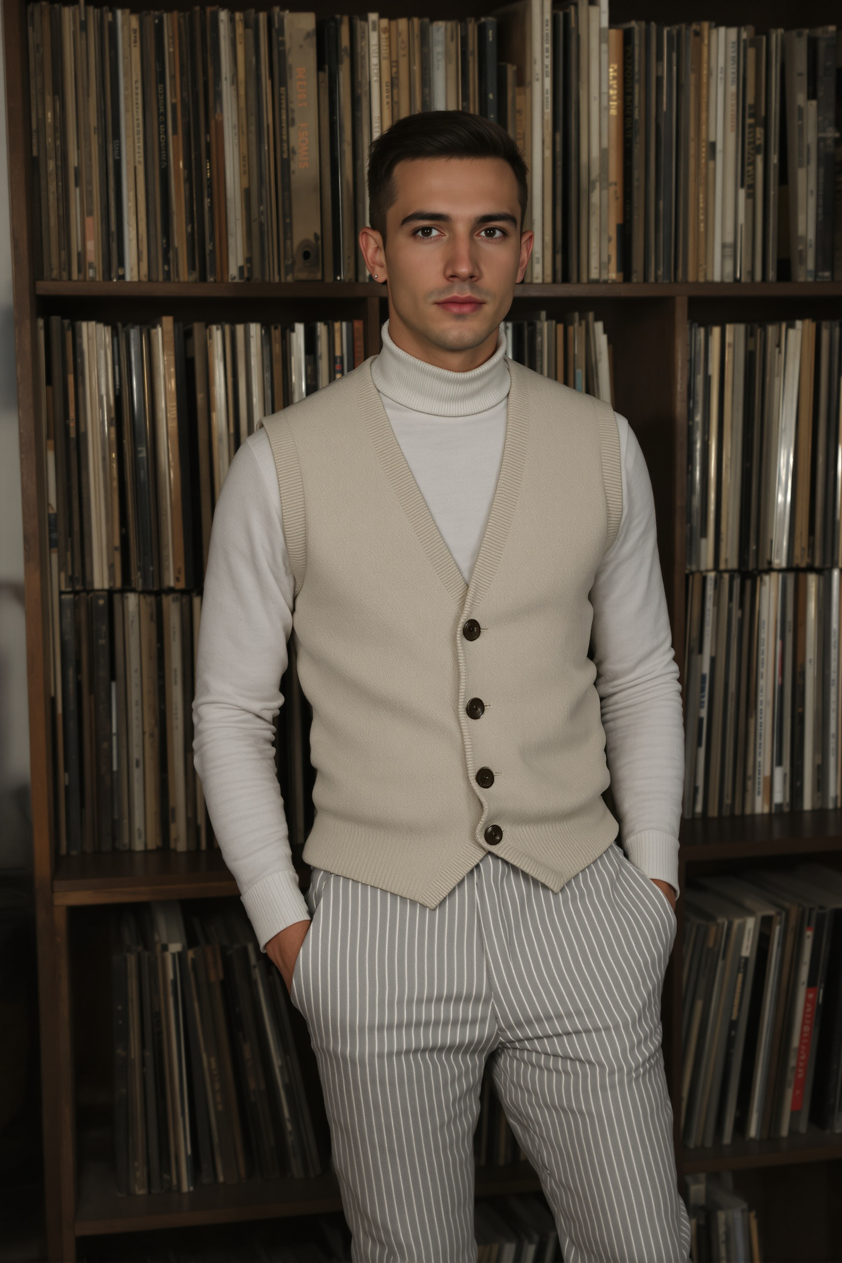 Мужчина в светлом свитере с высоким воротом и брюках в тонкую полоску, застегнутый жилет поверх, позирует стоя у старого книжного шкафа с виниловыми пластинками на полках, средний план, уверенный взгляд прямо в камеру, мягкое рассеянное освещение.