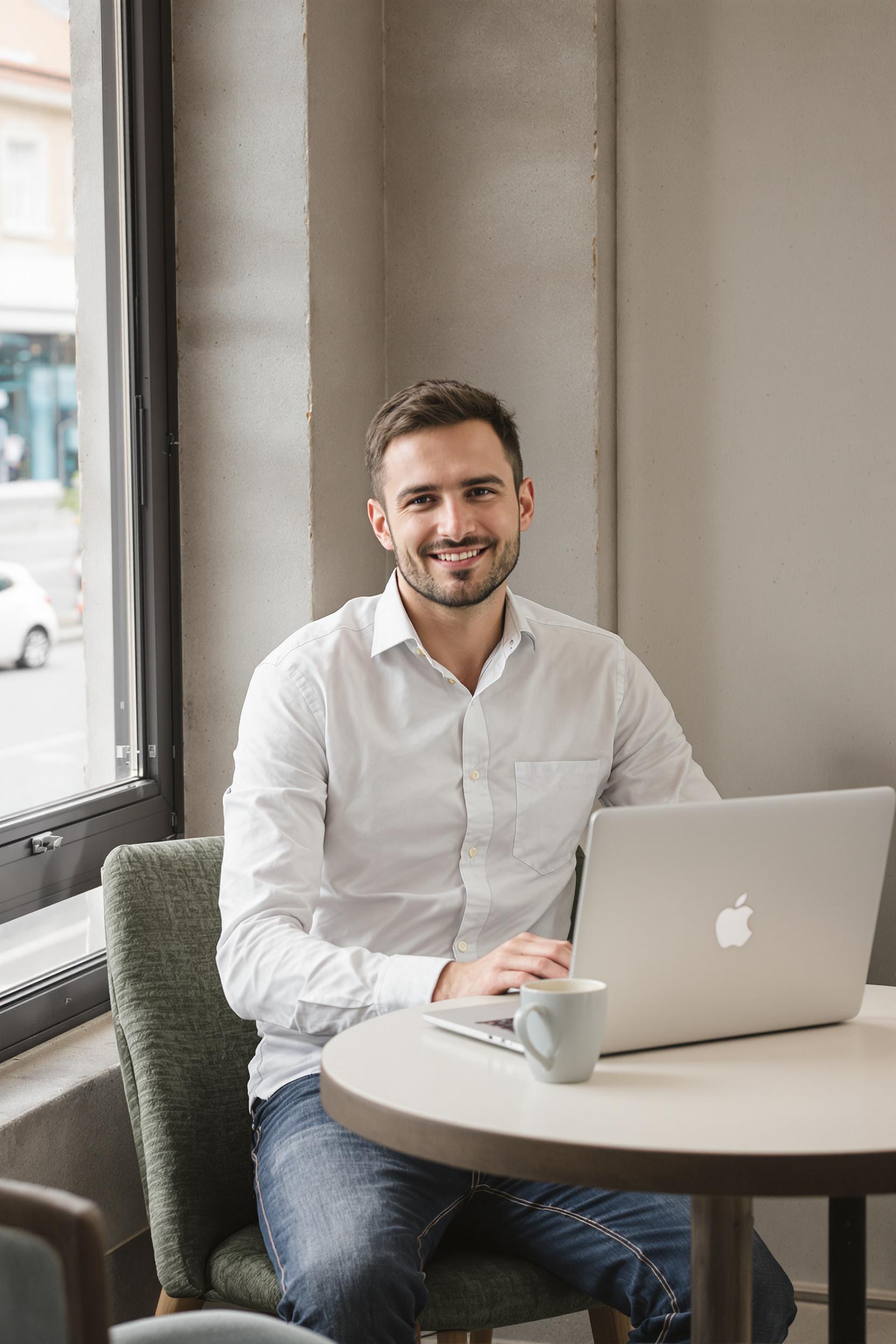 Мужчина в повседневной черной футболке и бежевых брюках сидит за деревянным столом в современной кофейне. Перед ним открыт ноутбук и чашка капучино, он смотрит прямо в камеру, на лице спокойная улыбка, вокруг теплый уютный интерьер, средний план.