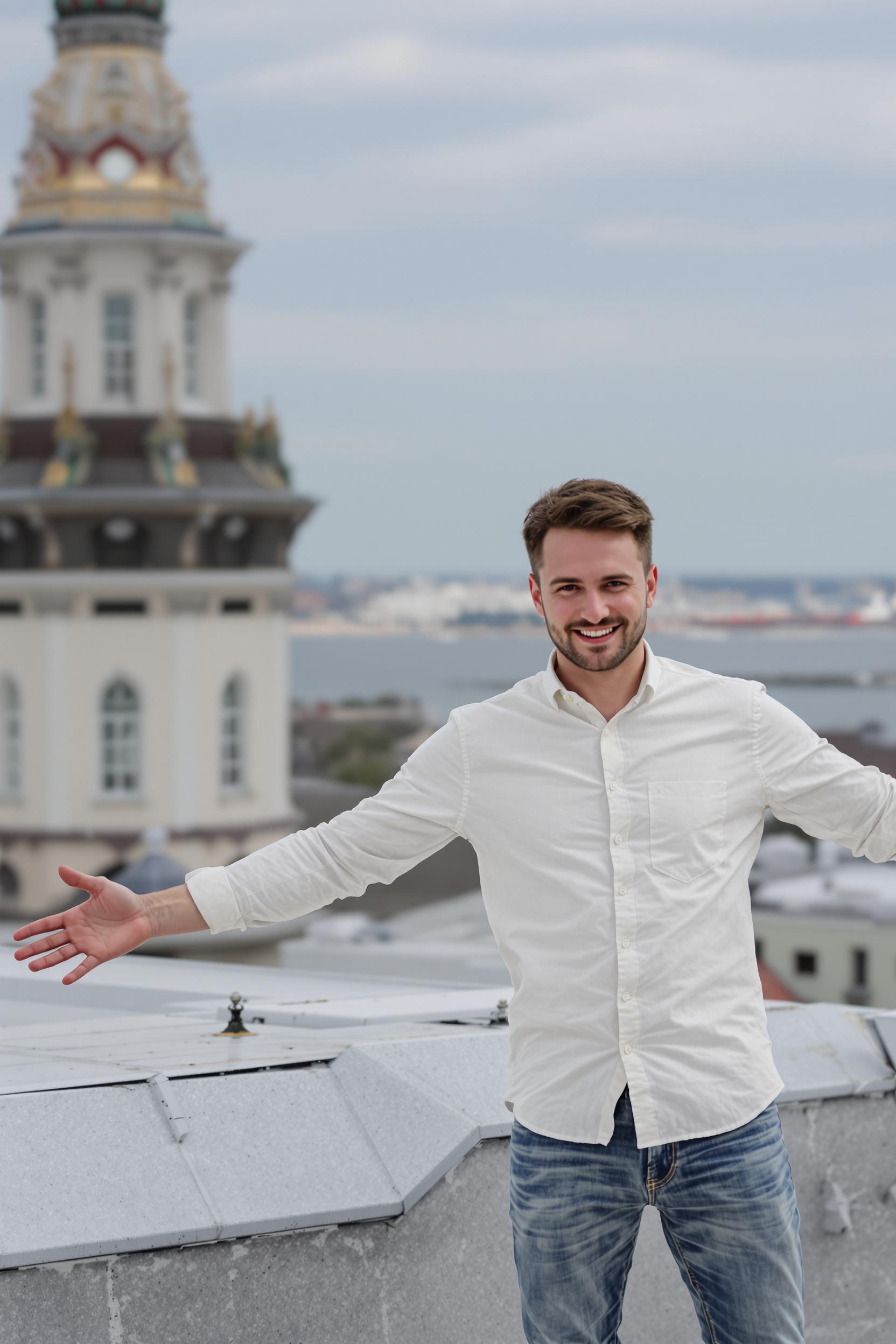 Мужчина в светлой рубашке и джинсах стоит на крыше питерского здания, руки раскинуты в стороны, позади — вид на стрелку Васильевского острова. Он улыбается и смотрит в камеру. Крупный план, ощущение простора.