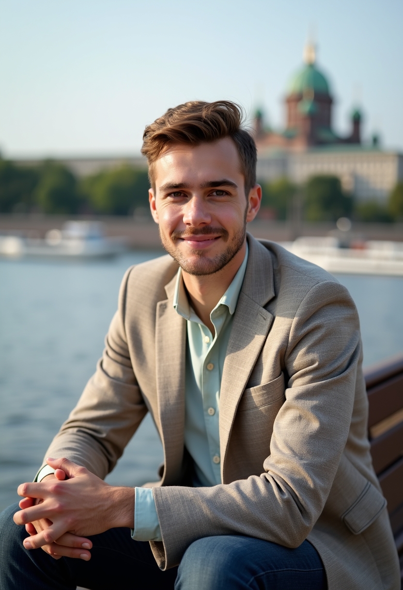 Мужчина в светлой рубашке и пиджаке сидит на лавочке у реки, его руки сложены, а на лице лёгкая улыбка. Позади Петропавловская крепость и медленно плывущие по Неве лодки. Крупный план, создающий атмосферу интеллигентности и летнего Петербурга.