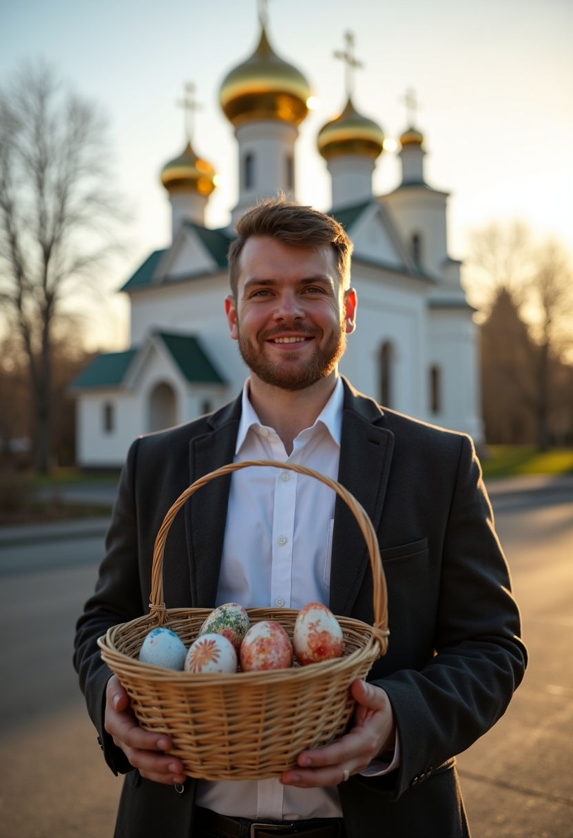 Мужчина в светлой рубашке и тёмном пальто стоит на фоне православного храма, его руки держат корзину с освящёнными куличами и крашеными яйцами. Он смотрит прямо в камеру с доброй улыбкой. Позади золотые купола сверкают на солнце. Крупный план, подчёркивающий торжественность момента.
