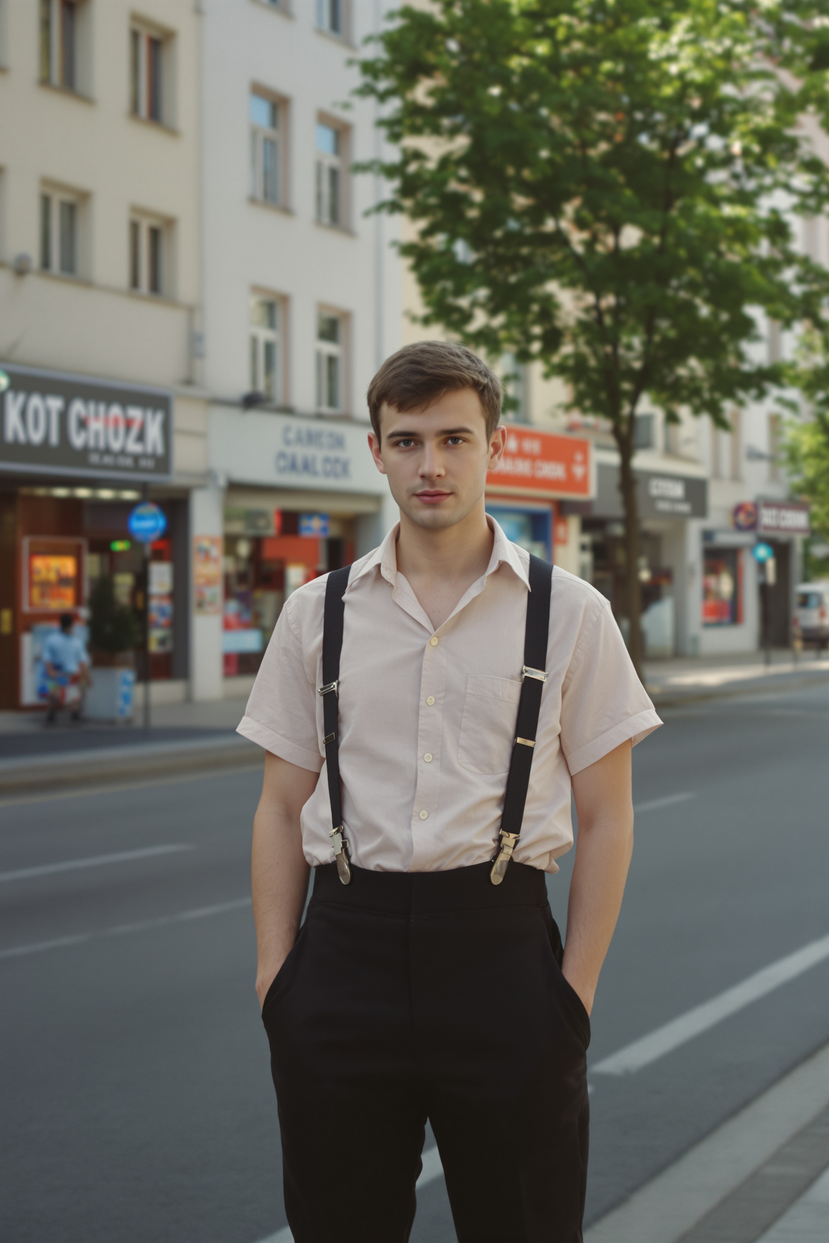 Мужчина в светлой рубашке с коротким рукавом и темных брюках на подтяжках, стоит на улице советского города с панельными домами и лавками, средний план, прямой взгляд в камеру, атмосфера пленочного фото, солнечный ретро-свет 80-х.
