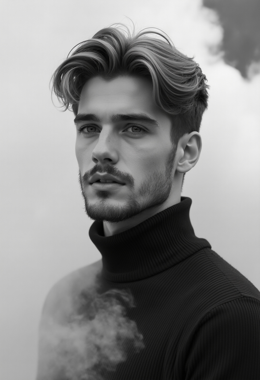 Мужчина в свитере с высоким воротом стоит среди клубов белого дыма. Его лицо крупным планом, взгляд направлен вбок, щетина подчёркивает текстуру кожи. Чёрно-белая гамма с акцентом на деталях.