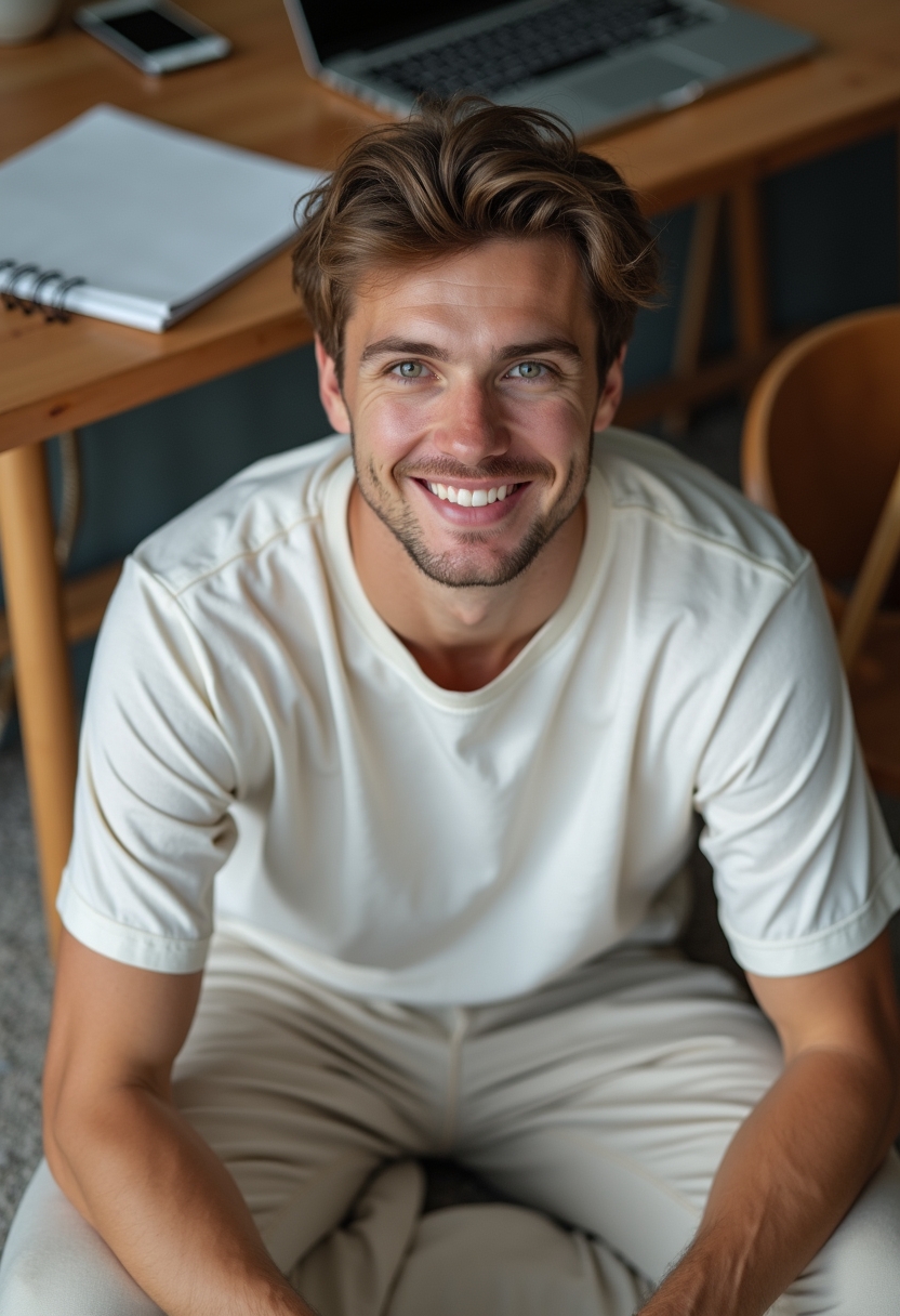 Мужчина в свободной футболке и льняных брюках сидит на полу возле низкого офисного столика с ноутбуком и стопкой журналов. Он смотрит вверх в объектив с улыбкой. Крупный план, акцент на лёгкости и открытости.
