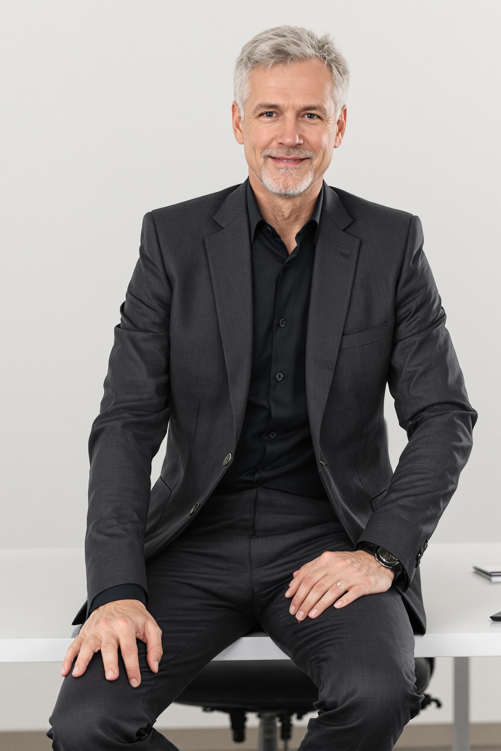 Мужчина средних лет в темно-сером тонком деловом костюме, чёрная базовая рубашка без аксессуаров, сидит боком на краю современного офисного стола, одной рукой опирается на поверхность, корпус развёрнут к камере, спокойный уверенный взгляд, минималистичный стиль, средний план.