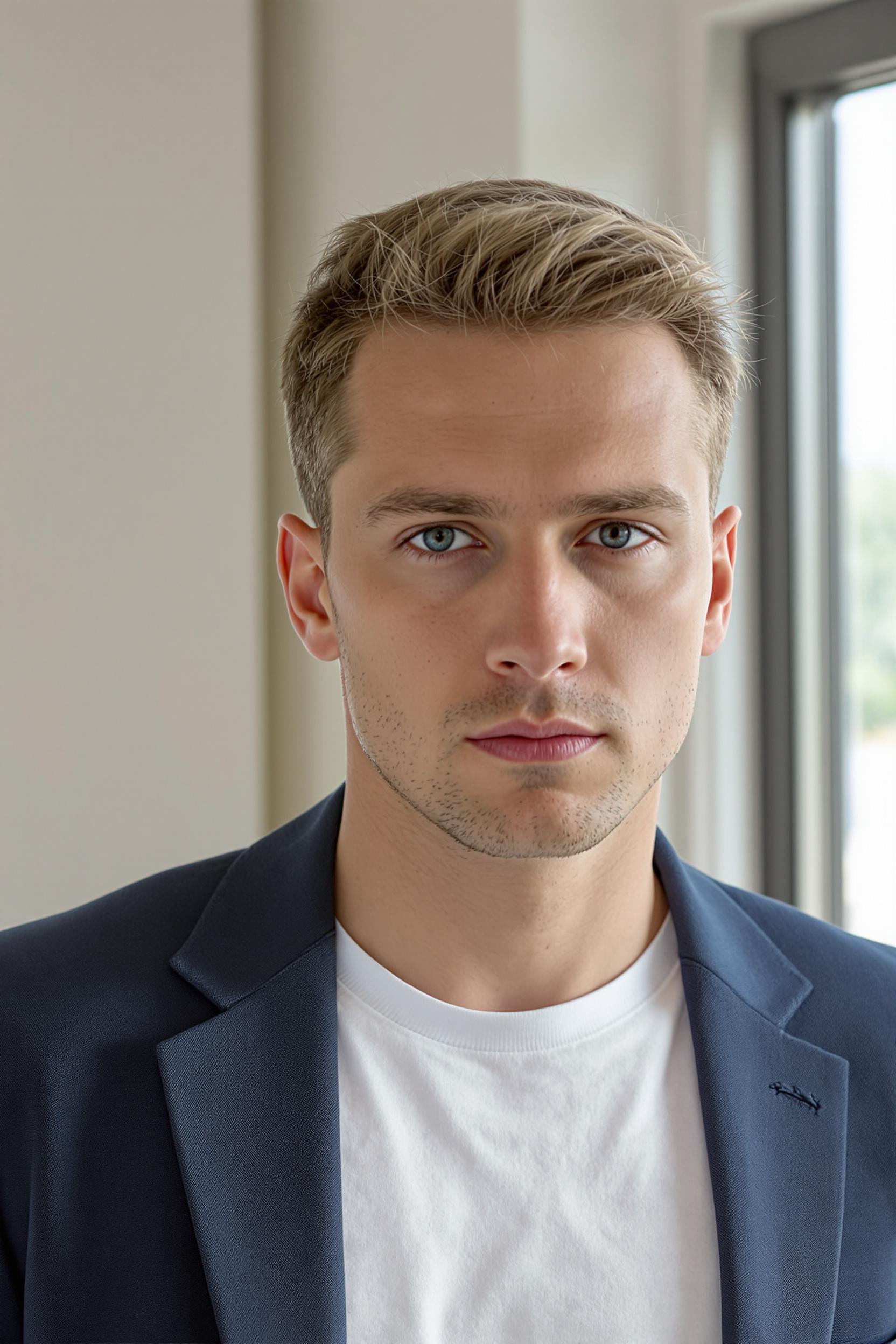 Мужчина в темно-синем блейзере и белой футболке, аккуратная причёска, серьёзный взгляд, крупный план лица и плеч на фоне мягкого натурального дневного света у окна, смотрит прямо в камеру