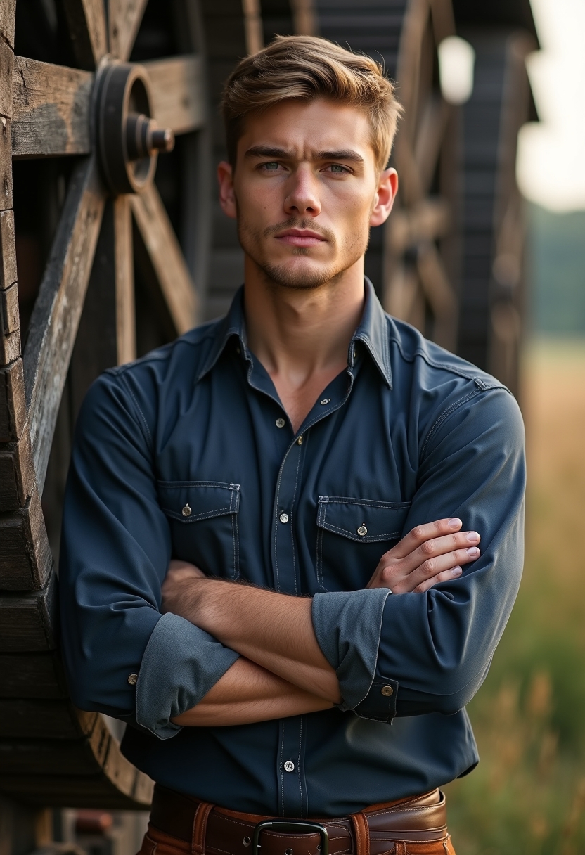 Мужчина в тёмно-синей рубахе с открытым воротом и сапогах стоит у старой мельницы. Его взгляд направлен прямо в камеру, а руки сложены на груди. Позади видны деревянные детали мельницы и высокие травы. Освещение тёплое, акцент на его мужественном образе.