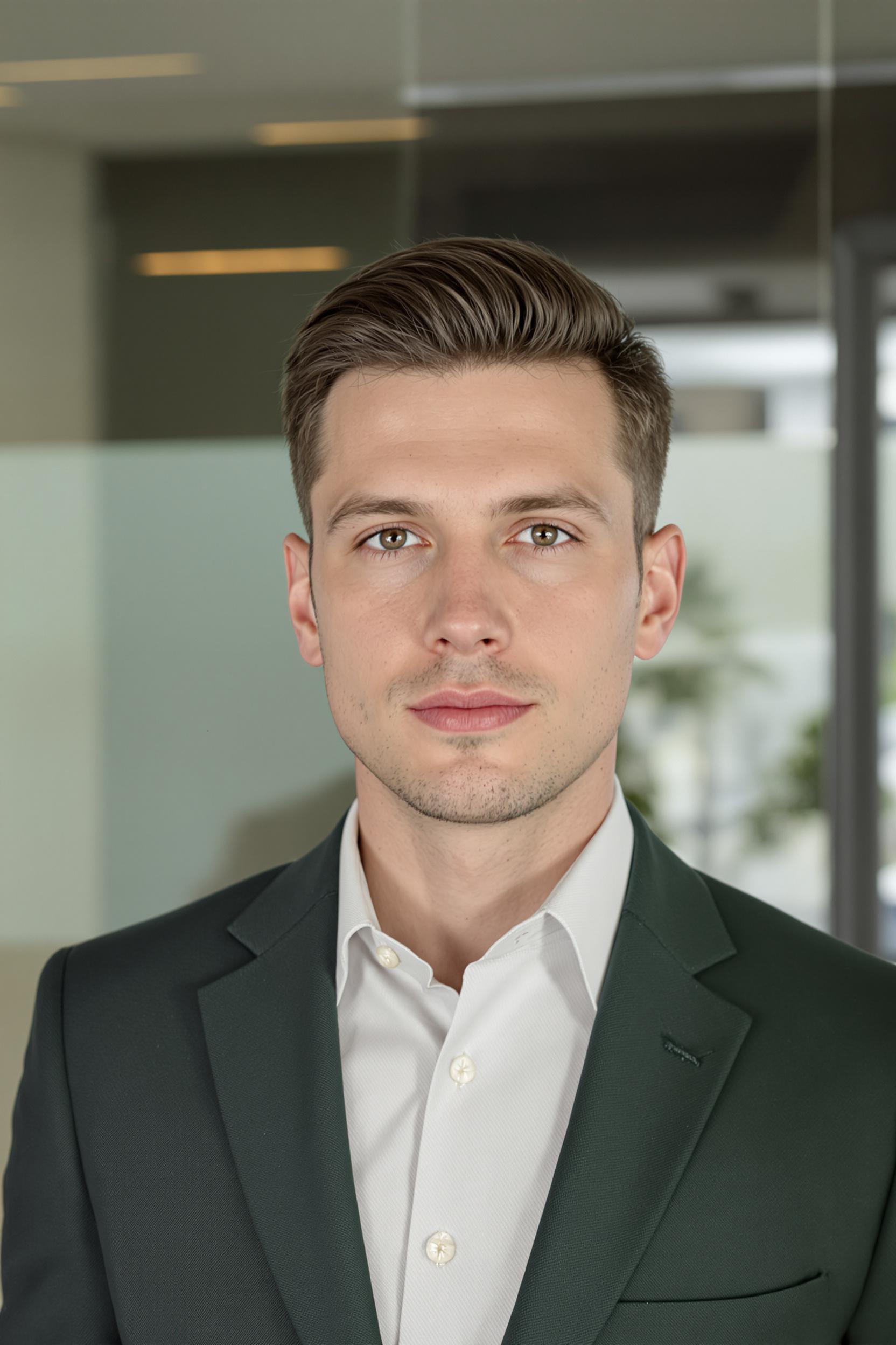 Мужчина в темно-зеленом деловом костюме и светлой рубашке, аккуратная причёска, крупный план лица и плеч на фоне минималистичной офисной перегородки из стекла, мягкое естественное освещение, уверенный взгляд прямо в камеру.