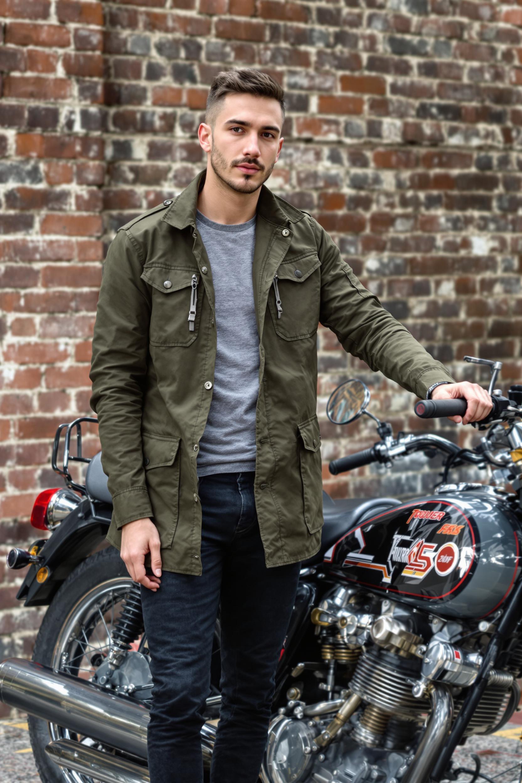 Мужчина в темно-зеленой ветровке, серой футболке и плотных черных джинсах стоит вполоборота у ретро-туриста-мотоцикла, держась одной рукой за седло. Смотрит в камеру уверенно, средний план, фон — кирпичная стена старого склада.