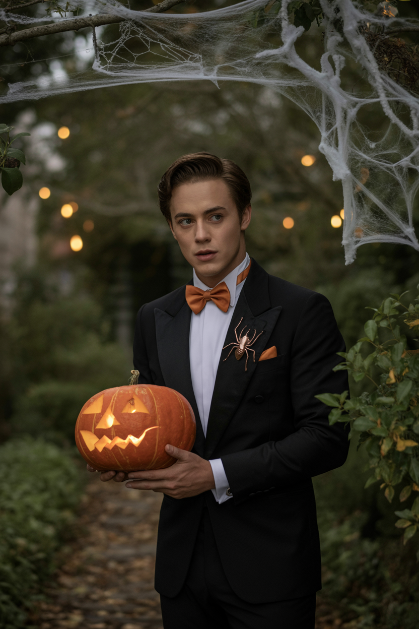 Мужчина в тёмном осеннем саду, одет в классический чёрный смокинг с оранжевым галстуком-бабочкой и белоснежной рубашкой, на лацкане знатный значок в виде паука, в руках держит фонарь из вырезанной тыквы, слегка склоняется вперёд, внимательно смотря в камеру, по саду тянется лёгкая паутина и мерцают светлячки.