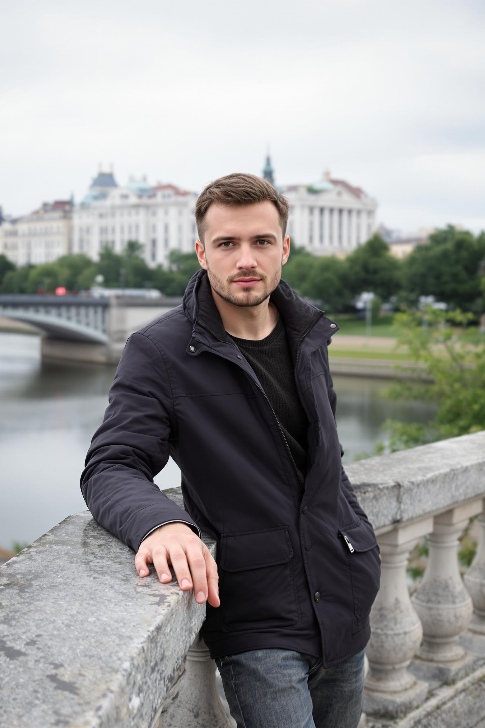 Мужчина в темном пиджаке стоит у гранитного парапета набережной, ладонь лежит на ограждении, он уверенно смотрит прямо в камеру. Позади — спокойная река, аксессуары городской архитектуры и зелень, рассеянный дневной свет, средний план.