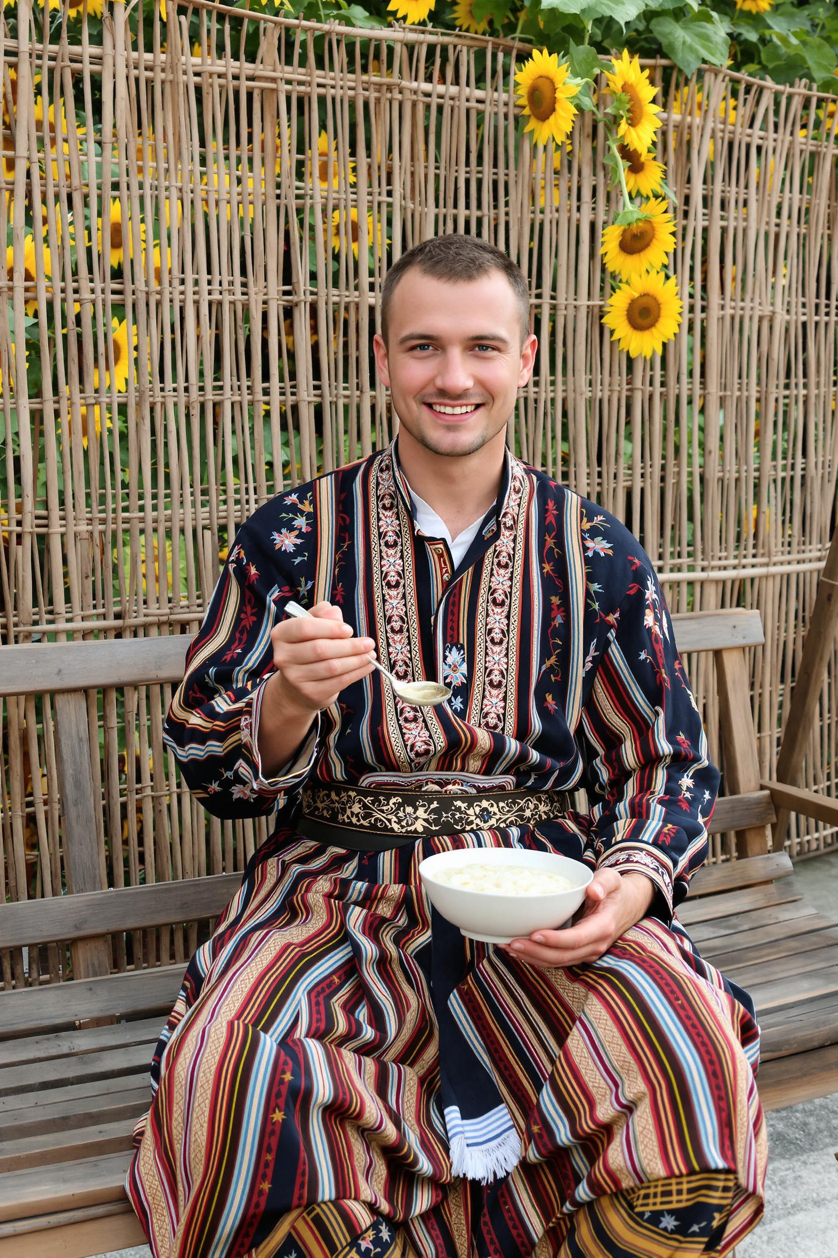 Мужчина в традиционной кафтане с поясом и валенками сидит на деревянной лавке у плетёного забора. В одной руке он держит ложку, в другой — миску с кашей, смотрит прямо в камеру с лёгкой улыбкой. На заднем плане подсолнухи и деревенский двор. Средний план, дневной свет.