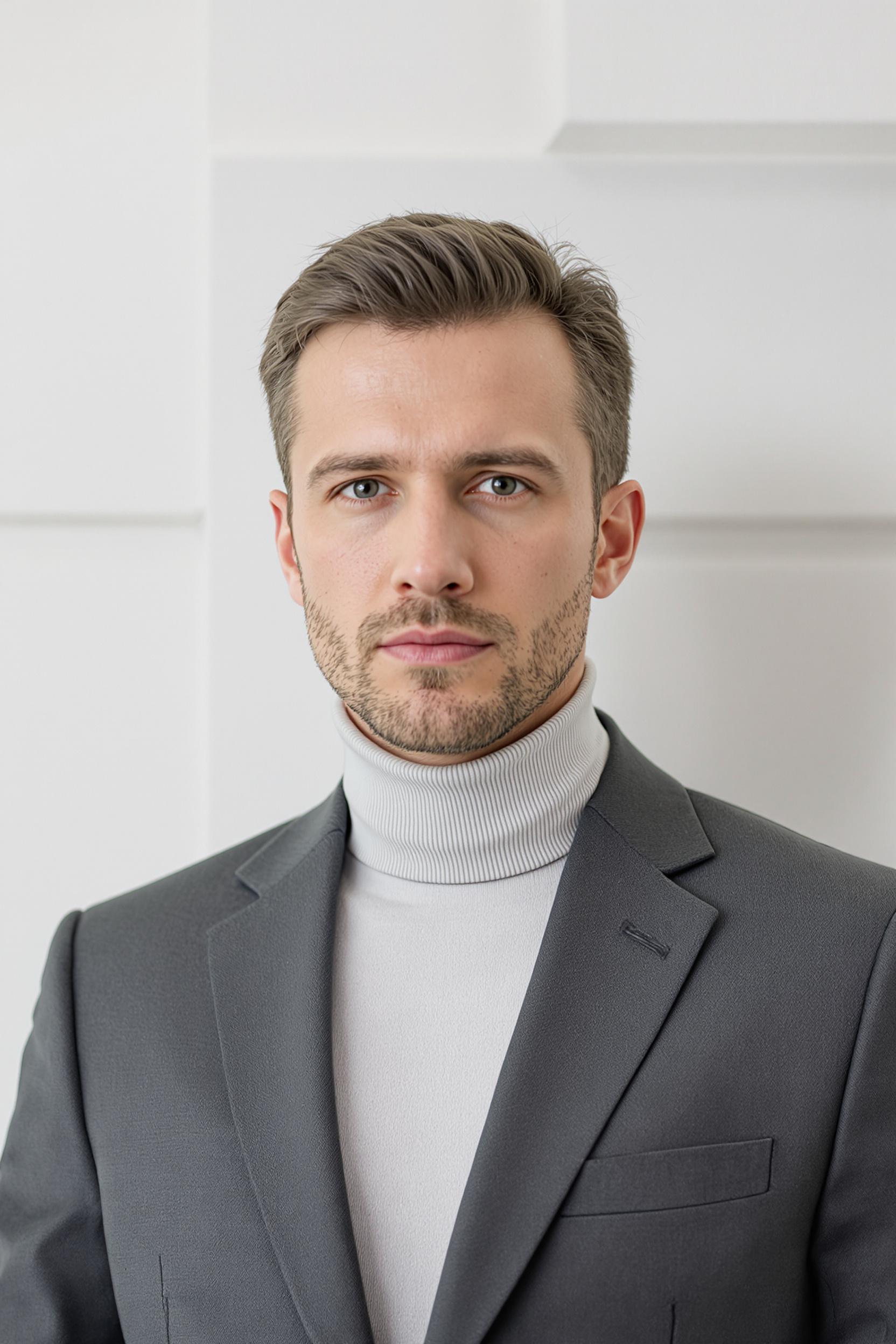 Мужчина в тщательно выглаженном графитовом костюме без лишних деталей, под пиджаком сдержанная светло-серая водолазка, фон — белая стена с элементами минималистичного дизайна, стоит лицом к камере, средний план, образ современного бизнесмена.