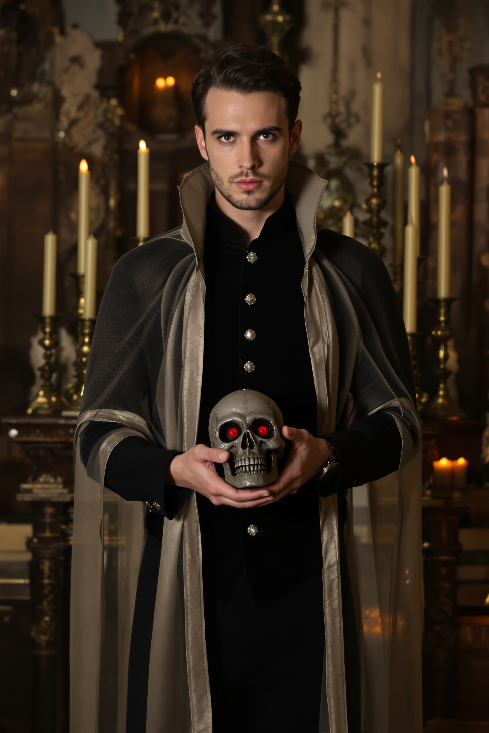 Мужчина в удлинённой черной рубашке с серебристыми пуговицами и бархатной жилетке, поверх — тонкий полупрозрачный плащ с заострёнными плечами. Стоит в средний план, держит декоративный череп с красными глазами, прямо смотрит в камеру. Позади — свечи и старинные книги, настроение загадочное.