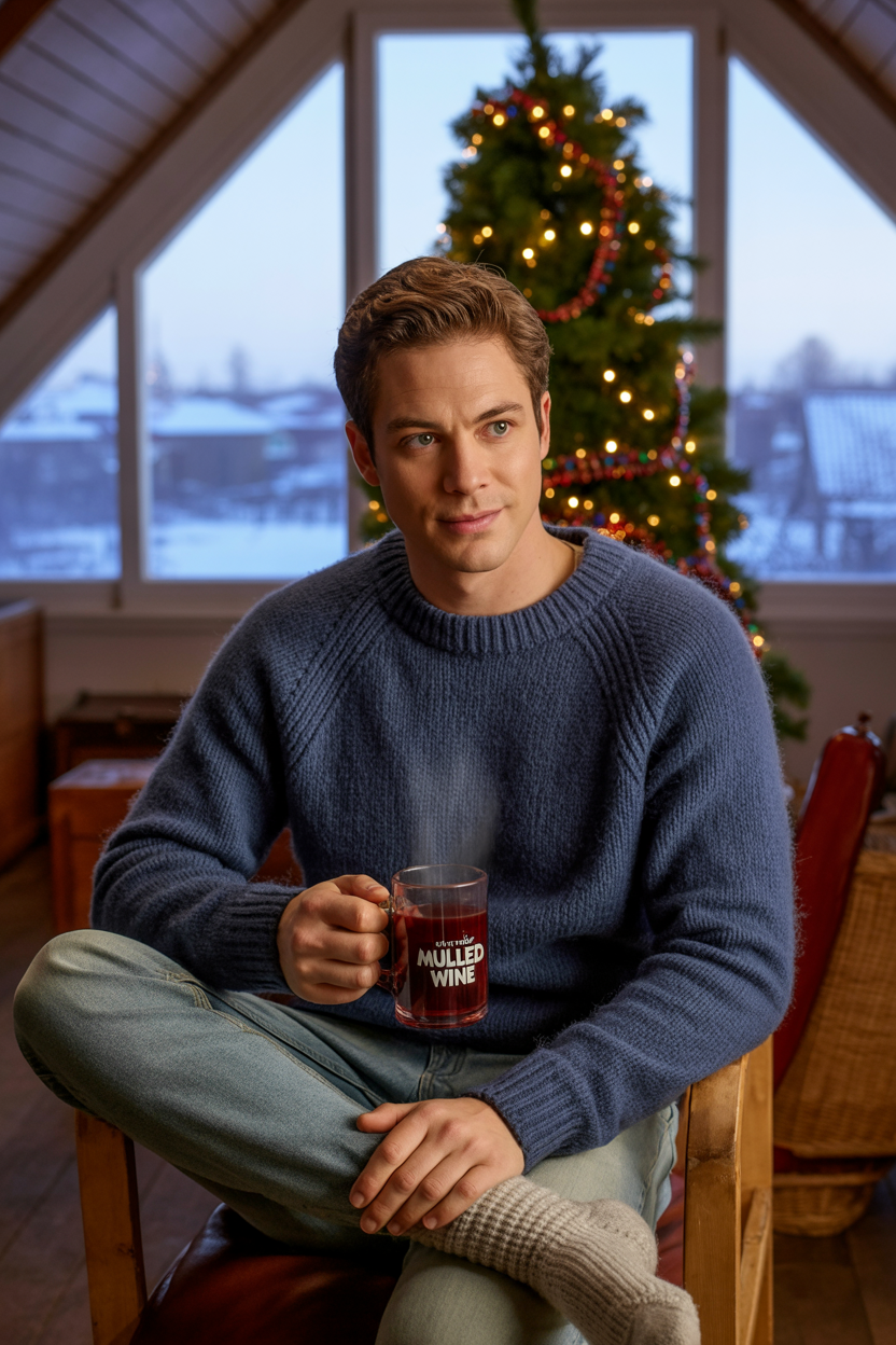 Мужчина в уютной мансарде с наклонными окнами у средней наряженной ёлки, одет в мохеровый тёмно-синий свитер с рукавами реглан, заправленный в светлые джинсы, на ногах теплые серые носки. Он сидит на низкой кушетке, скрестив ноги, держит кружку с глинтвейном, смотрит прямо в камеру, на заднем фоне гирлянды.