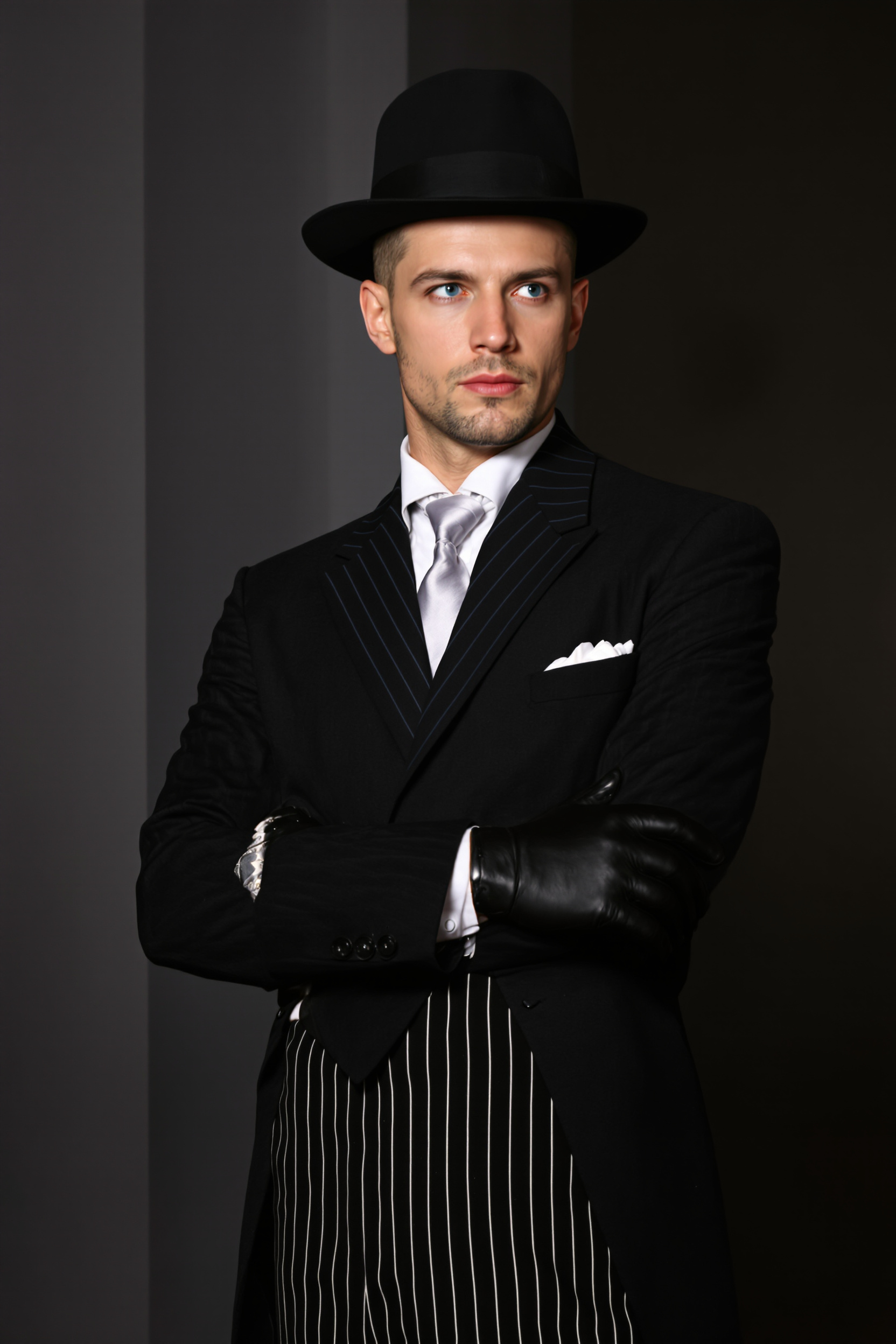 Мужчина в винтажном черном костюме гангстера 20-х годов: длинный однобортный пиджак, полосатые брюки, белая рубашка, шёлковый галстук, тёмные кожаные перчатки. Он стоит боком, смотрит через плечо прямо в камеру, руки скрещены на груди, крупный план.