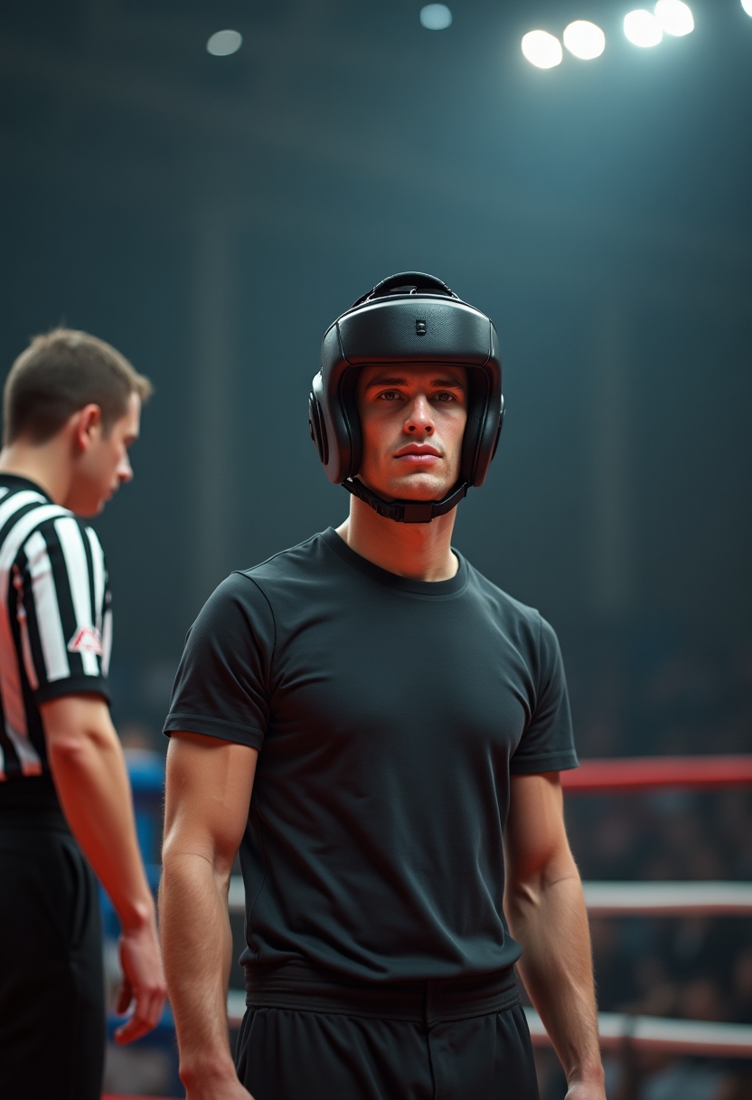 Мужчина в защитном шлеме стоит в центре ринга, смотрит прямо в камеру, позади виден судья