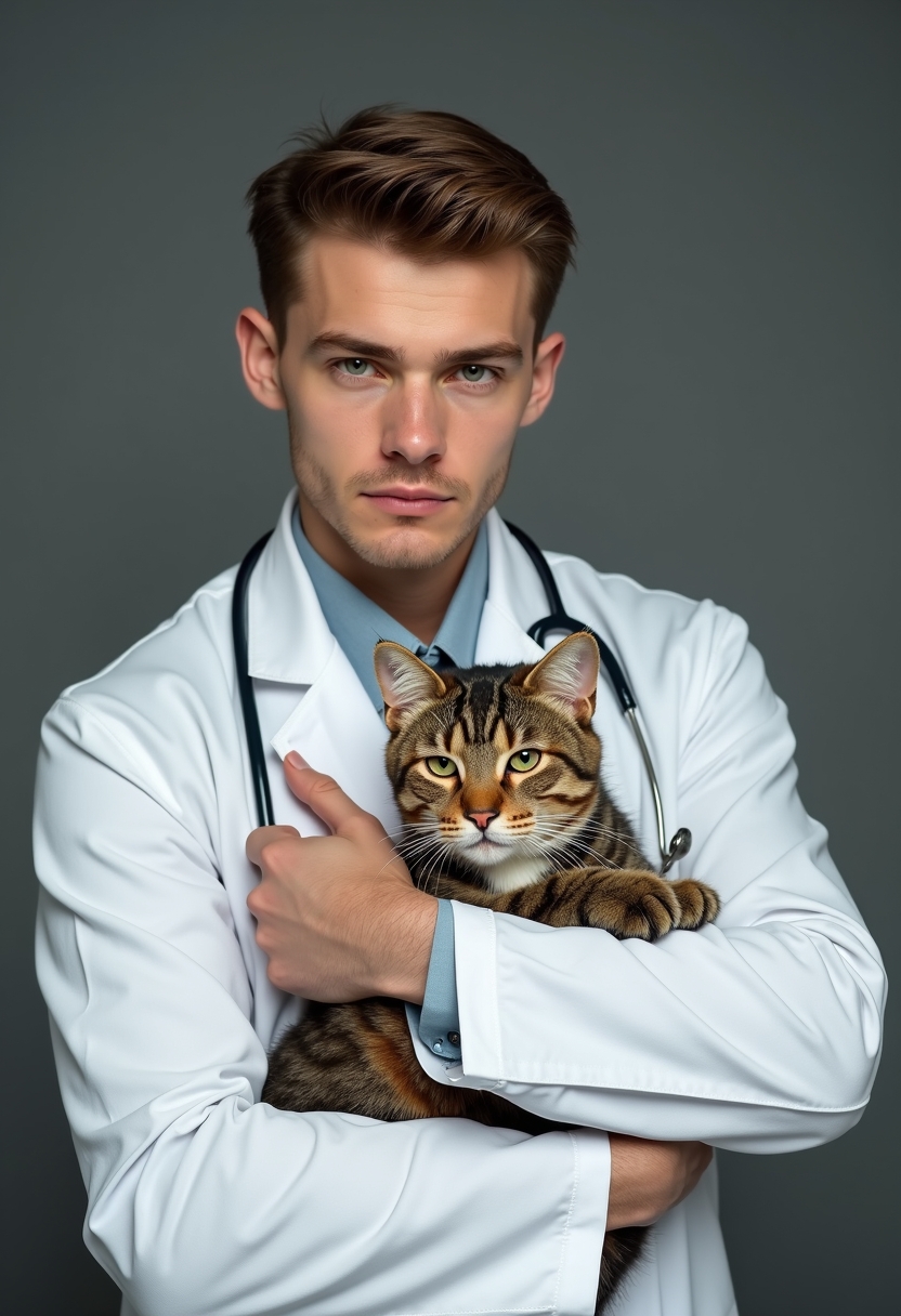 Мужчина-ветеринар в белом халате держит на руках трёхцветную кошку, лицо серьёзное и внимательное. Он смотрит в камеру, а кошка расслабленно устроилась на его руках. Крупный план, студийная съёмка, акцент на профессионализме.