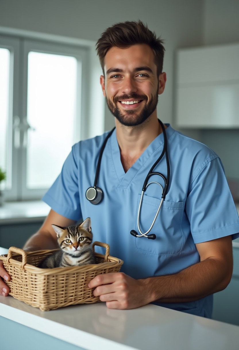 Мужчина-ветеринар в форме стоит у стойки ресепшн, рядом на стойке — корзинка с котёнком. Он смотрит в камеру с открытой улыбкой, вокруг — чистый современный интерьер клиники. Крупный план, образ доступности и радушия.