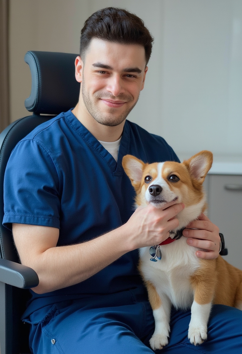 Мужчина-ветеринар в современной голубой форме сидит на стуле, рядом на коленях — маленькая собака породы корги. Он гладит её и смотрит в объектив с мягкой улыбкой. Крупный план, нейтральный светлый фон.