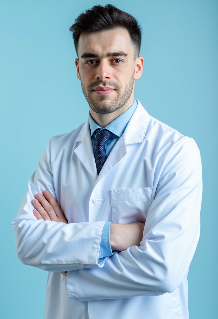 Мужчина-врач в белом халате с серьёзным выражением лица, крупный план на фоне светло-голубого градиента, смотрит прямо в камеру
