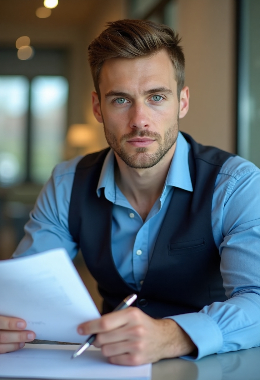 Мужчина-юрист в синей рубашке и жилете сидит в переговорной, листает договор и делает пометки. Он смотрит в камеру, фон — стеклянная стена и деловой интерьер. Крупный план.