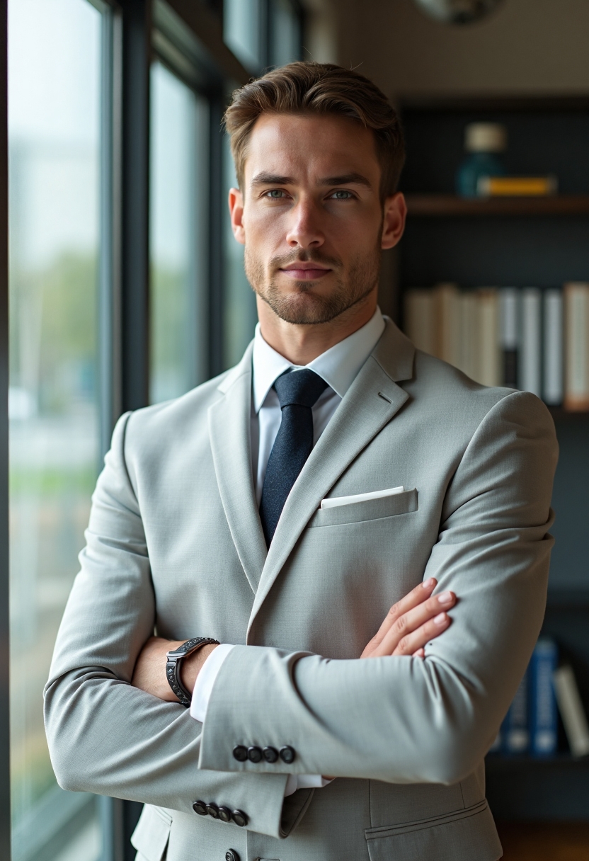 Мужчина-юрист в светлом костюме и галстуке стоит у окна, скрестив руки на груди, за спиной видны книги и папки. Он смотрит уверенно прямо в объектив. Крупный план, современный стиль.