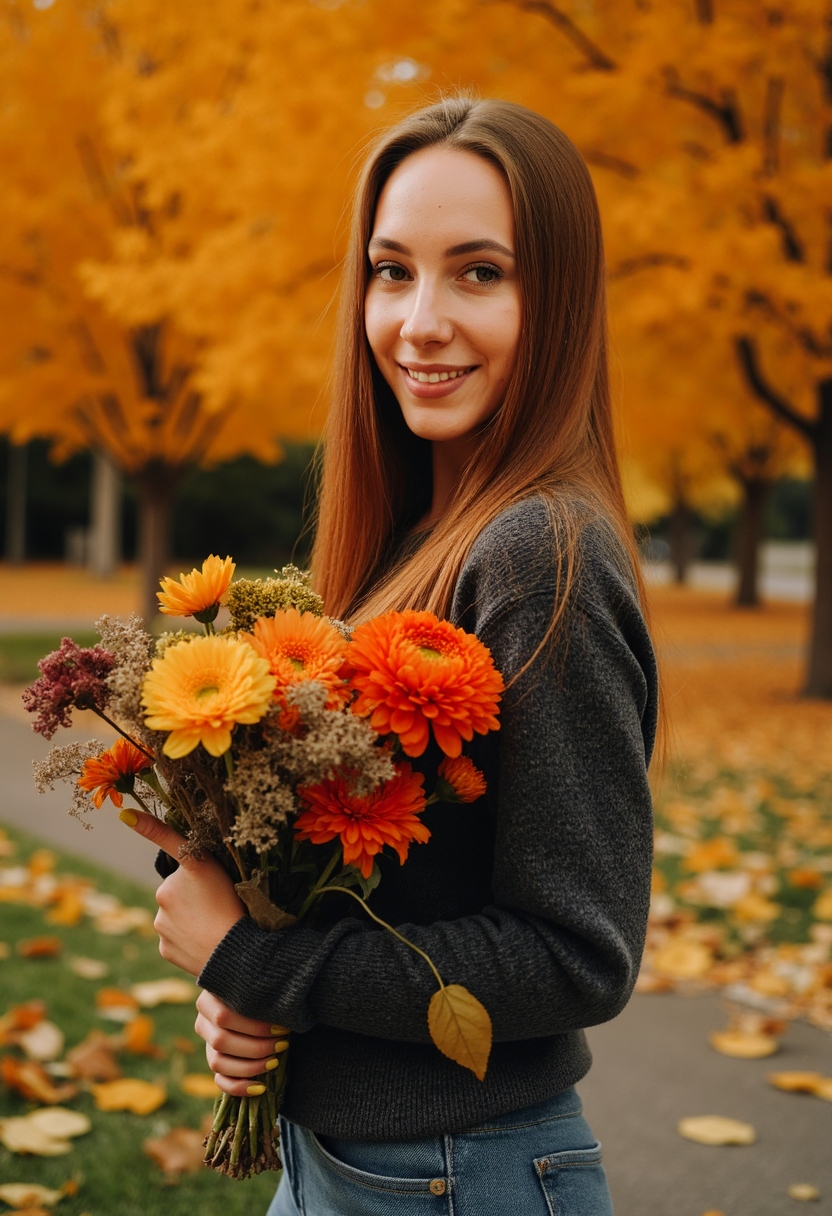 На фоне осеннего сада, где деревья окрашены в яркие жёлтые и оранжевые оттенки, позирует девушка с длинными каштановыми волосами, обрамляющими лицо. Она одета в уютный свитер тёмного цвета и джинсы. В руках — букет из ярких хризантем, засохших листьев и оранжевых гербер. Осенние листья мягко падают вокруг, а лёгкий ветер треплет его волосы, свет заката придаёт всему тёплый оттенок.
