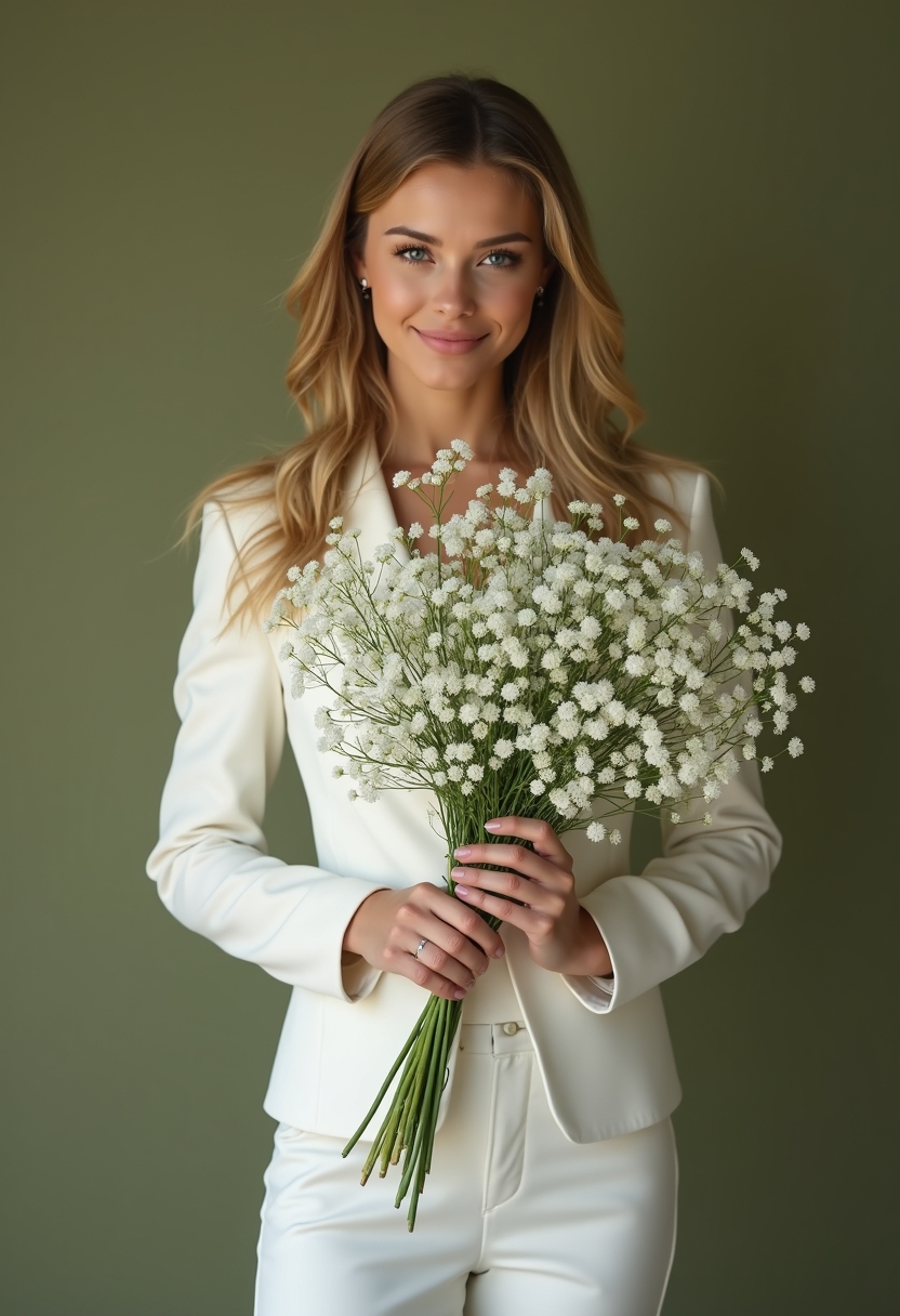На фоне приглушенного оливково-зеленого цвета стоит женщина в белом брючном костюме. В руках у нее большой букет белых мелких цветов, гипсофилов. Она смотрит в камеру с легкой улыбкой, выражение лица спокойное и умиротворенное. Руки нежно обхватывают букет