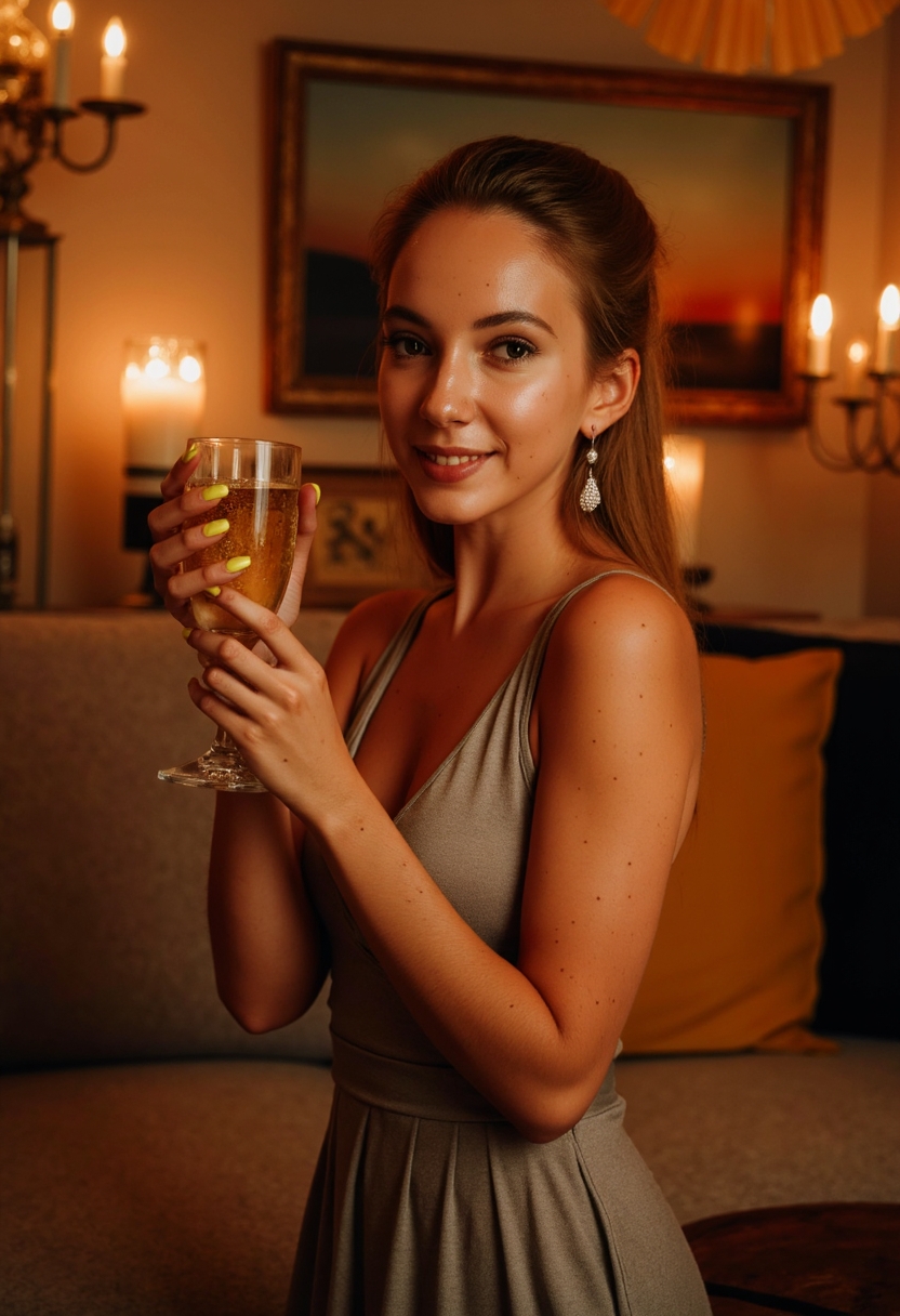 На фотографии изображена элегантная женщина в длинном вечернем платье с блестящей тканью и драпировкой. Её волосы уложены в романтические волны, украшенные жемчужными серьгами. Женщина танцует на фоне декора с классическим мотивом, с бокалом шампанского в руке. Макияж выразительный, с акцентом на губы и глаза. Свет волшебный и мягкий, создающий атмосферу праздника и романтики. В фоне — светящиеся люстры и закатные огоньки, что делает образ ещё более эффектным.