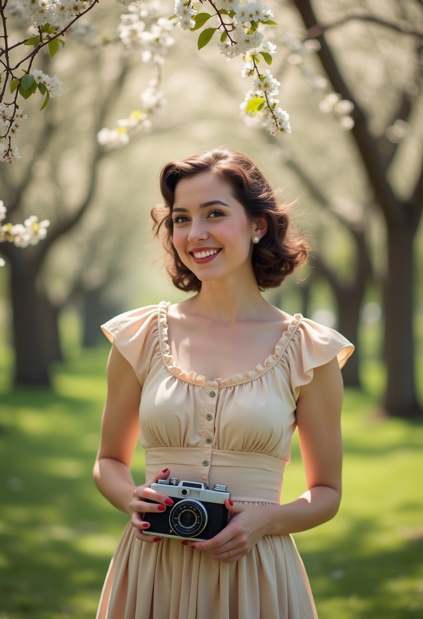 На фотографии изображена молодая женщина в светлом винтажном платье 40-х годов, стоящая в парке среди цветущих деревьев. Платье с пышной юбкой и небольшими рюшами, а на талии — широкий пояс. Её волосы уложены в аккуратные локоны, а в ушах — небольшие жемчужные серьги. Женщина улыбается и держит в руках чёрно-белую фотокамеру, создавая атмосферу лёгкости и свободы. Свет на фотографии яркий и радостный, играя на листьях деревьев и создавая мягкие тени на земле.