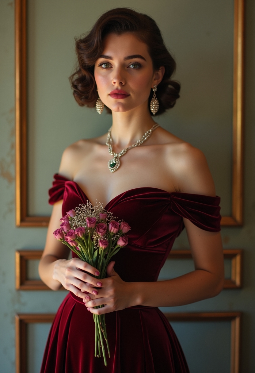 На фотографии изображена молодая женщина в вечернем винтажном платье 40-х годов, выполненном из тёмно-красного бархата. У неё аккуратная прическа с завитыми локонами и крупными ювелирными серьгами. Женщина стоит на светлом фоне старинного театра, держа в руках цветы, а её лицо освещено мягким светом. Атмосфера фотографии исполнена грации и утончённости, вызывая ассоциации с гламуром и элегантными приемами.