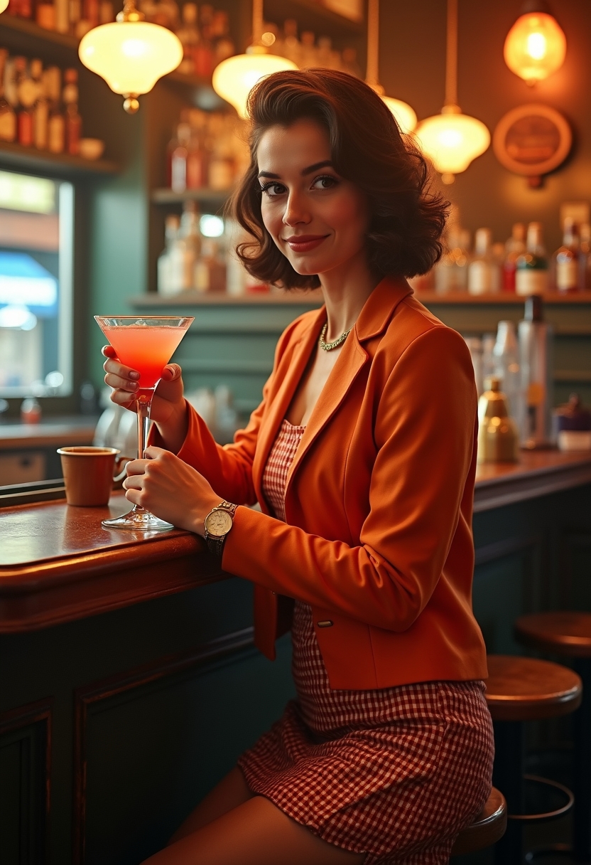 На снимке изображена молодая женщина в ярком винтажном пиджаке и юбке 40-х годов, она облокотилась о стойку старинного бара, где подают коктейли. У неё короткие волнистые волосы и лёгкий макияж с акцентом на глаза. Женщина держит в руках коктейль и смотрит в камеру с задорной улыбкой. Атмосфера весела и жизнерадостна, а свет на фотографии яркий и праздничный, подчеркивающий детали бара и её стильный образ.