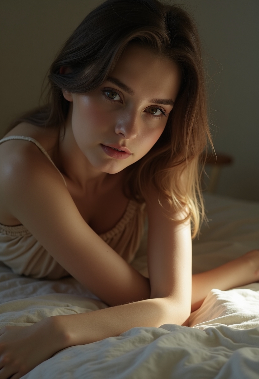 На снимке изображена женщина, полулежащая на поверхности. Её тело обращено немного вправо от зрителя. Одна рука вытянута в сторону и опирается о поверхность, а другая согнута и лежит на колене. Её тело освещено мягким, рассеянным светом, создавая игру света и тени, подчеркивающую контуры. Выражение лица спокойное, возможно, немного сдержанное. Губы слегка поджаты, взгляд направлен прямо на зрителя. В её взгляде читается уверенность и спокойствие. Общая атмосфера на фотографии спокойная и умиротворяющая. Цветовая палитра приглушённая, преобладают нейтральные тона, которые создают ощущение интимности.