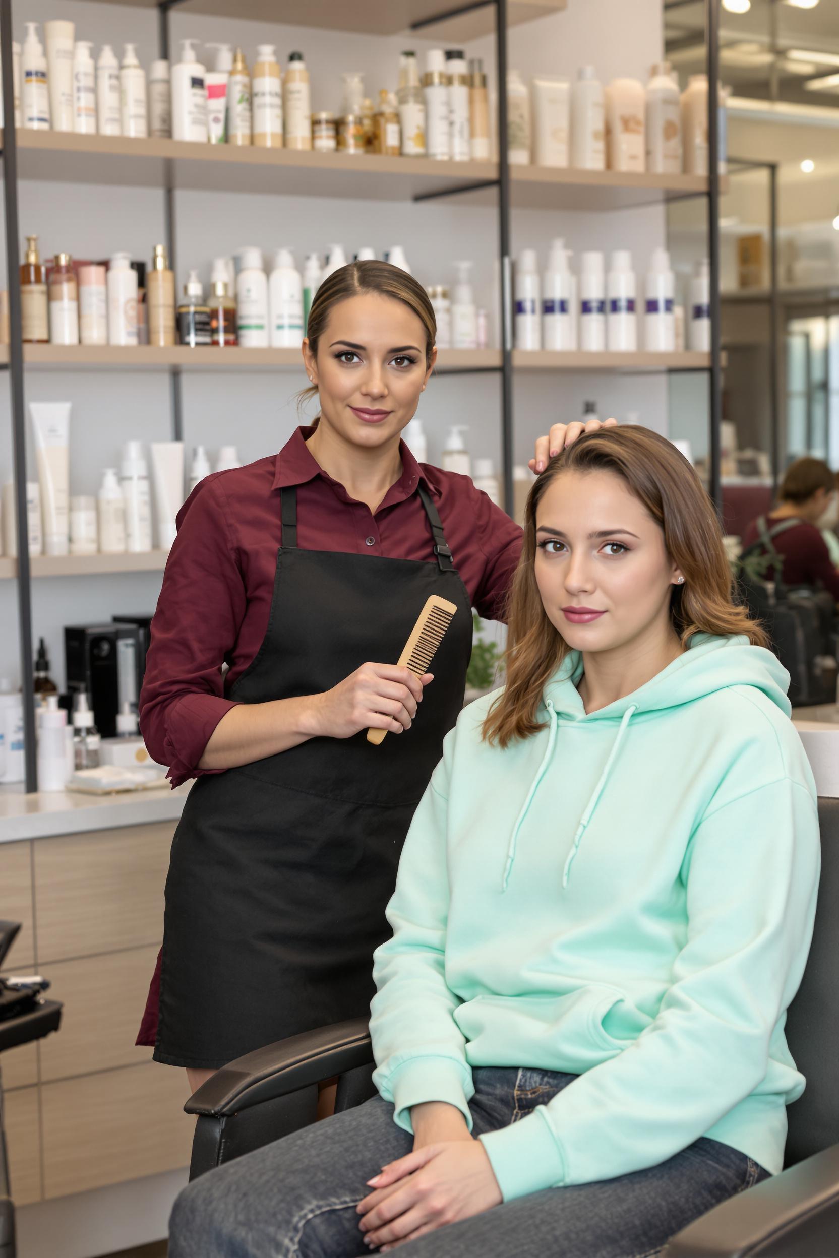 На среднем плане женщина-парикмахер в бордовом платье-рубашке и коротком черном фартуке держит расческу, рядом в кресле клиент в мятной толстовке и темных джинсах, оба смотрят прямо в объектив, за спиной видны полки с уходовой косметикой.