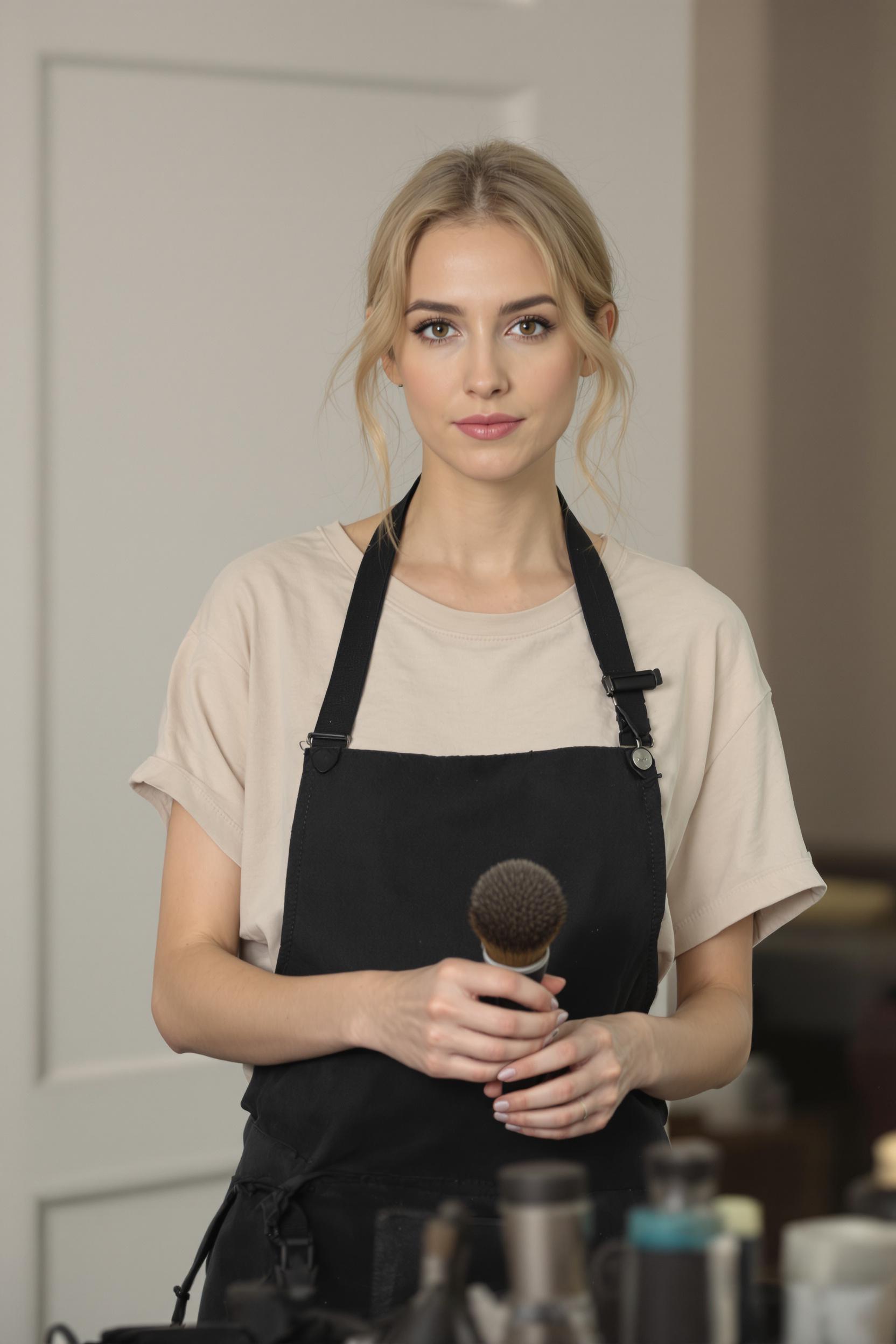 На среднем плане женщина-парикмахер в светло-бежевой футболке свободного кроя и коротком черном фартуке. Она смотрит прямо в камеру, аккуратно держит в руках круглую профессиональную расческу, фон — минималистичный светлый интерьер.