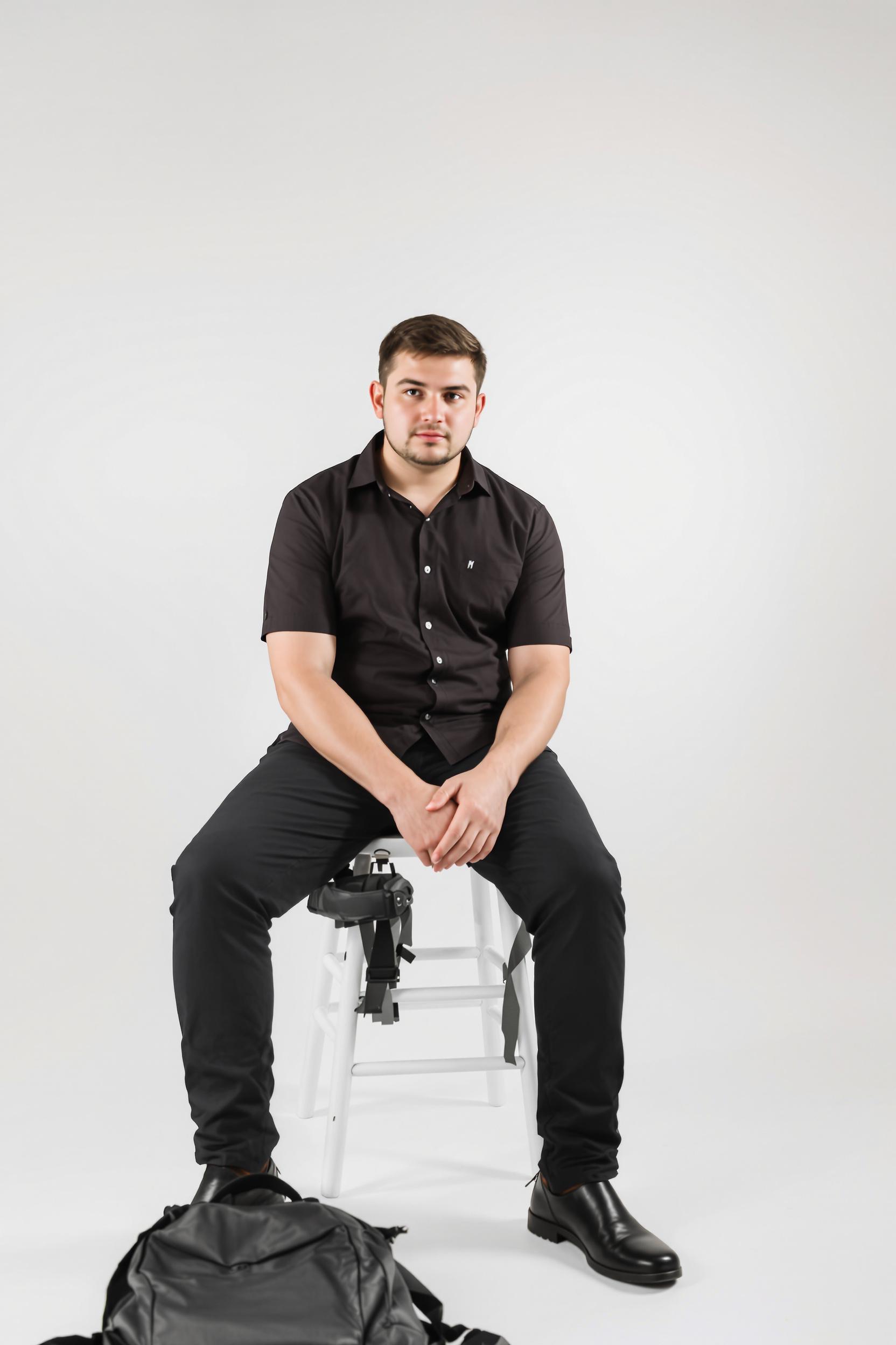 Мужчина в базовой темной рубашке сидит на белом табурете посреди циклорамы, глядя прямо в камеру. Рядом на полу минималистичный рюкзак, поза уверенная, акцент на чистых линиях и спокойствии, свет мягкий.
