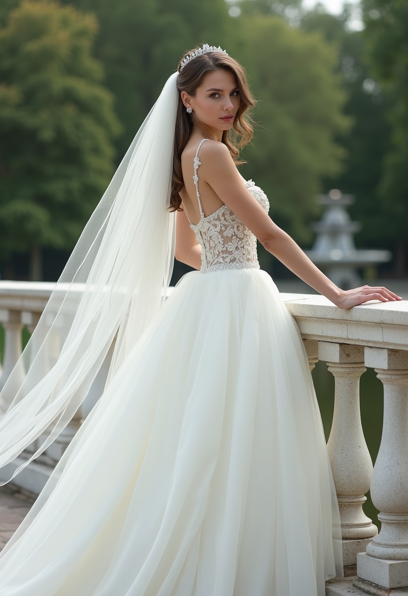 Невеста в белом платье с пышной юбкой стоит на мраморном мосту, держась за изящные перила. Она смотрит через плечо в камеру, её фата слегка приподнята ветром. Позади видны парк и классическая архитектура дворца. Освещение мягкое, акцент на её грации.
