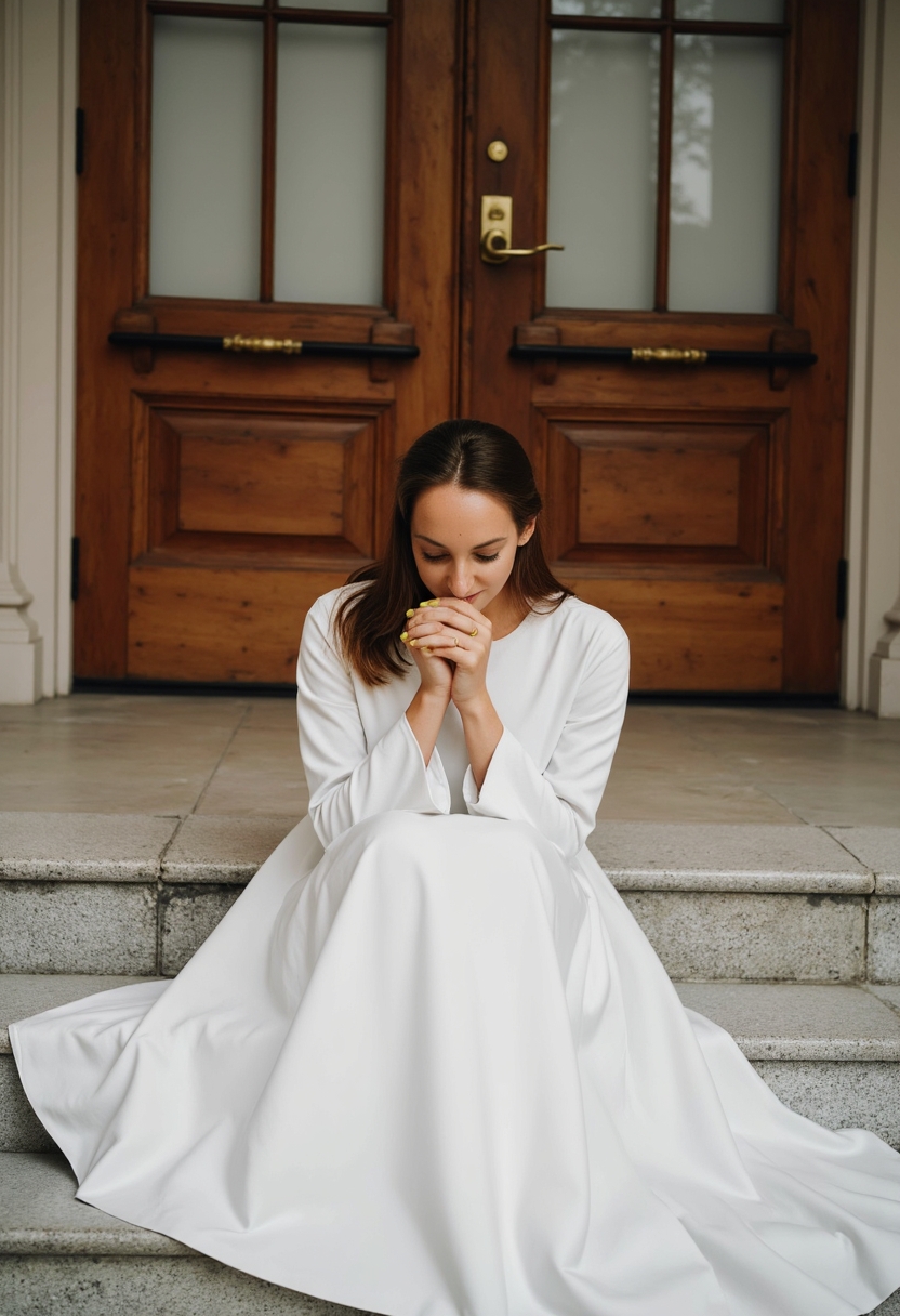 Невеста в белом платье с широкими рукавами сидит на ступенях большого особняка, её руки сложены в молитвенном жесте, а взгляд направлен вниз. Позади видны резные двери и высокие окна. Освещение естественное, акцент на её задумчивом образе.