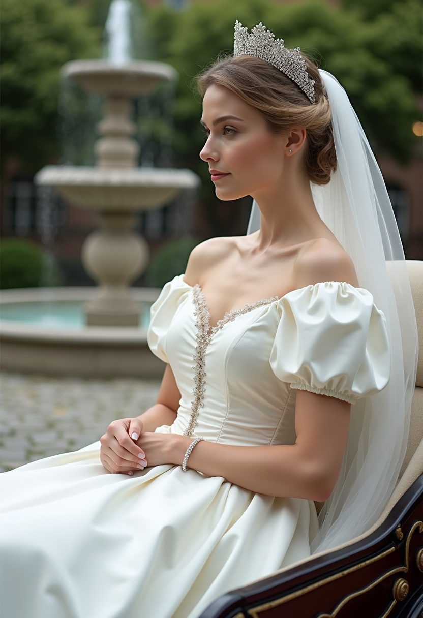 Невеста в классическом белом платье сидит на винтажном карете, запряжённой белыми лошадьми. Её руки лежат на подоле, взгляд направлен в сторону. Позади виден мощёный двор с фонтаном. Освещение дневное, акцент на аристократичности образа.