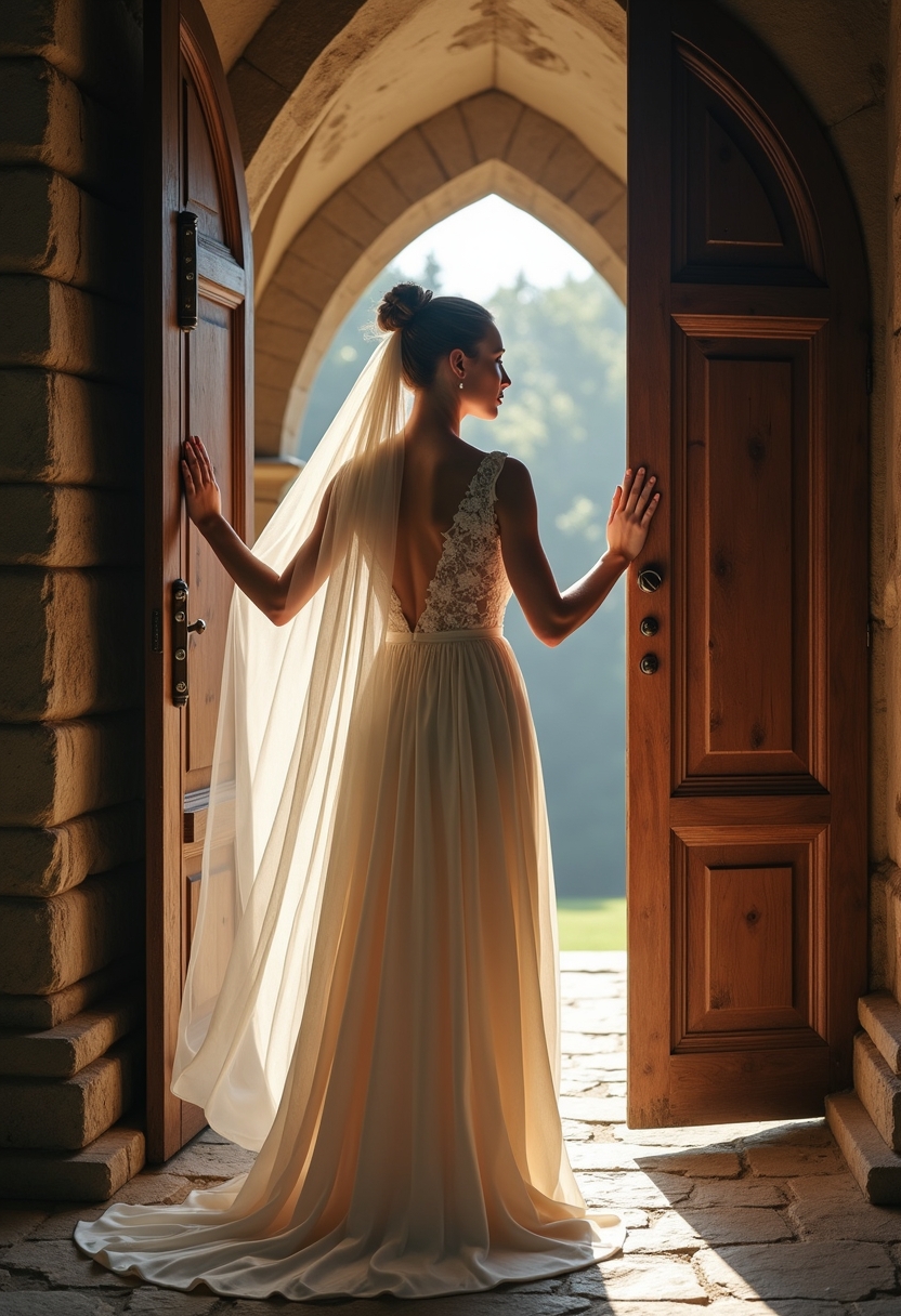 Невеста в платье с открытой спиной стоит у входа в старинный замок, держась за массивную деревянную дверь. Её взгляд направлен через плечо, фата развевается на ветру. Позади видны готические арки и каменная кладка. Освещение тёплое, акцент на мистической романтике.