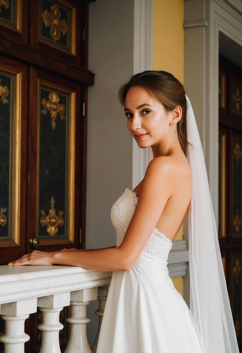 Невеста в свадебном платье с длинной фатой стоит на балконе дворца, опираясь на мраморные перила. Её взгляд направлен вдаль, руки лежат на ограждении. Позади видны высокие двери с позолоченными элементами. Освещение естественное, акцент на её изящности.