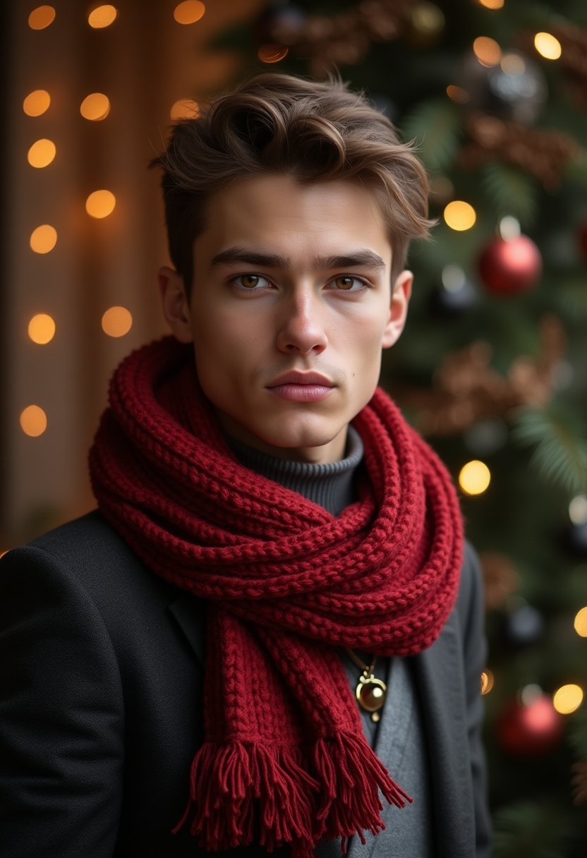 Он на фоне новогодних украшений, вокруг гирлянды и шары