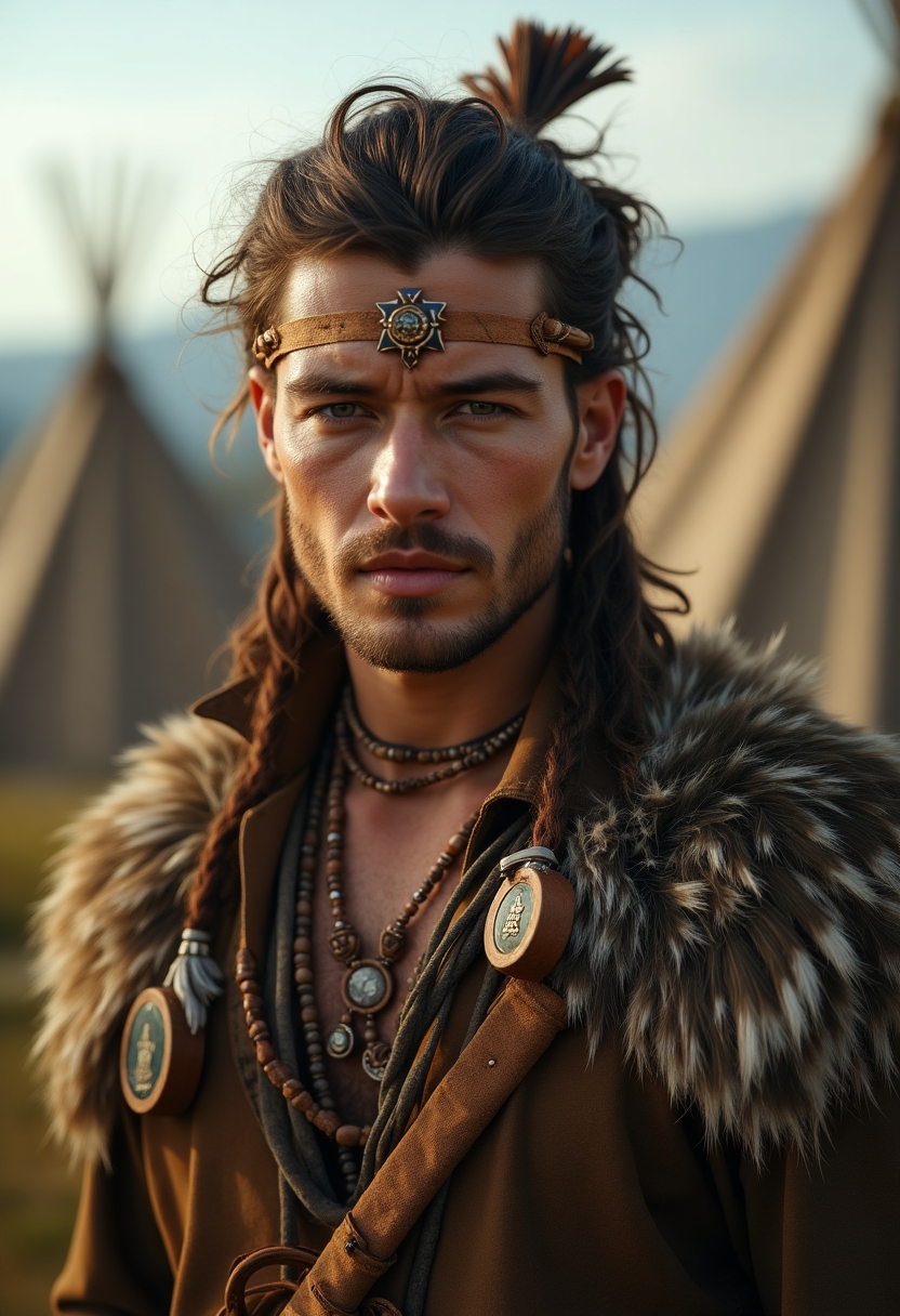 Он с украшениями из перьев и амулетов, на фоне палаточного лагеря