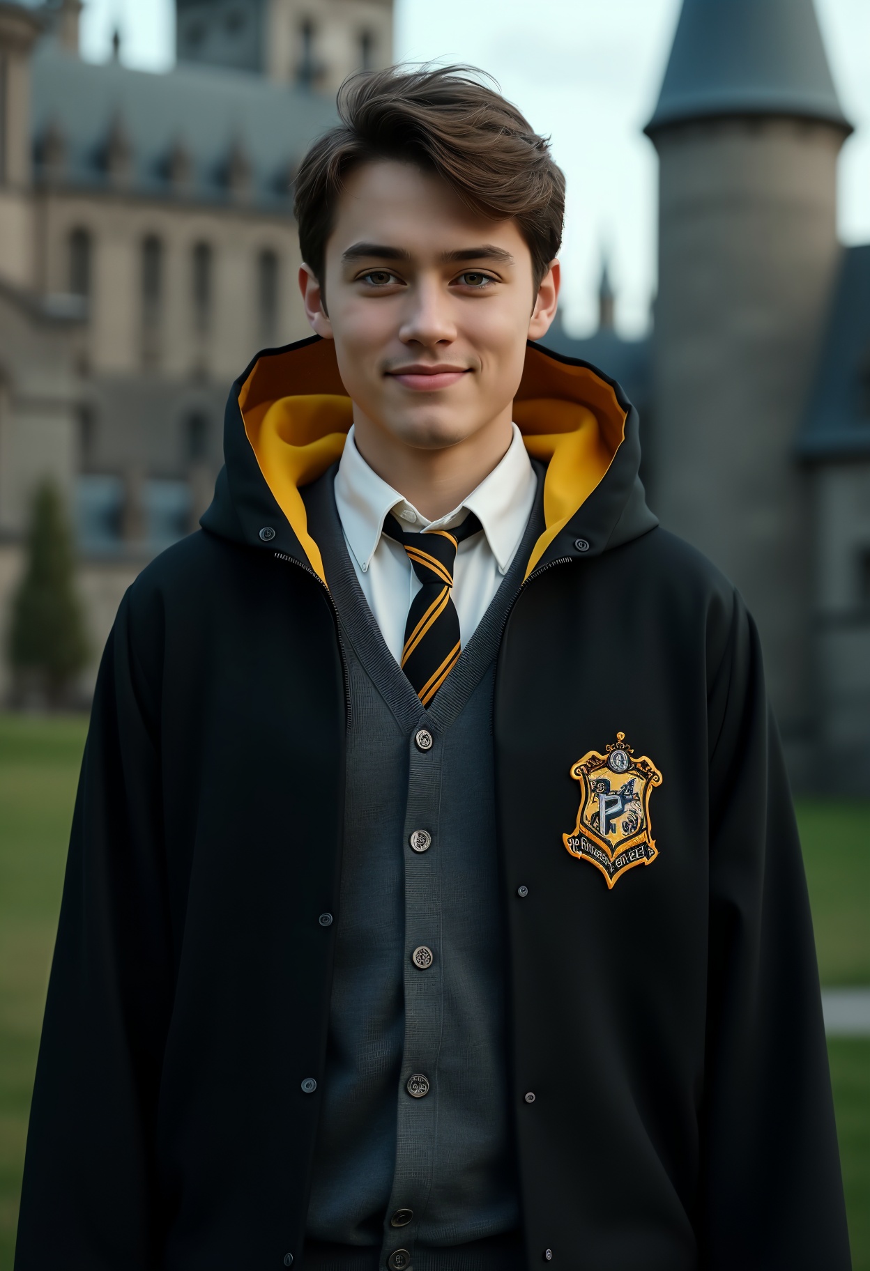 Он в чёрной мантии с жёлто-чёрной подкладкой и эмблемой барсука, в сером кардигане, белой рубашке и жёлто-чёрном галстуке на фоне Хогвартса