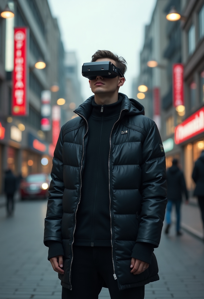 Он в киберпанк-костюме с очками дополненной реальности, на фоне улиц мегаполиса